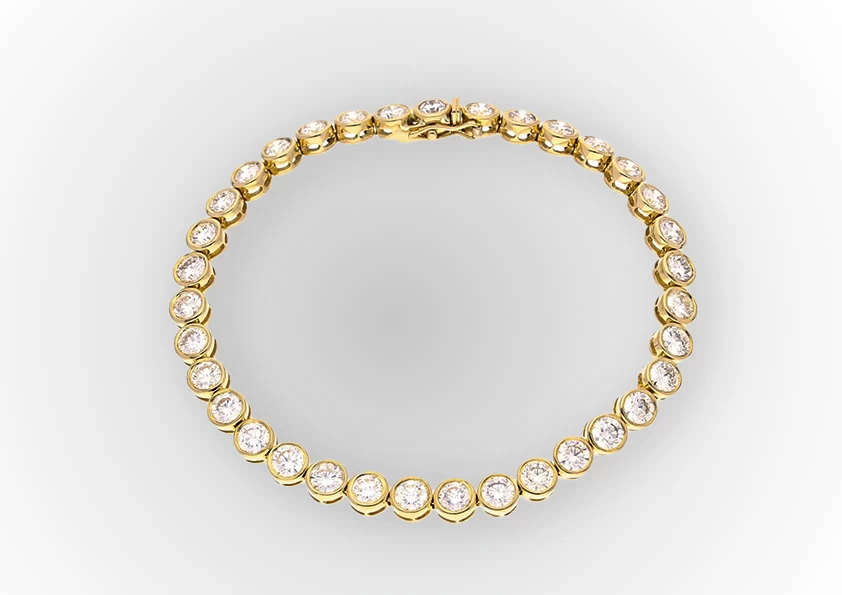 DescriptionThis spectacular 8" 14.00ct diamond tennis bracelet is a piece of jewelry that is guaranteed to catch everyone's attention. The brilliant diamonds are expertly set, making it a timeless addition to any collection. 5 mm wide in 18 karat yellow gold, the length of this magnificent tennis bracelet is inches, and it weighs 23.36 grams. Both of the piece's round, white diamonds are identical in form. |