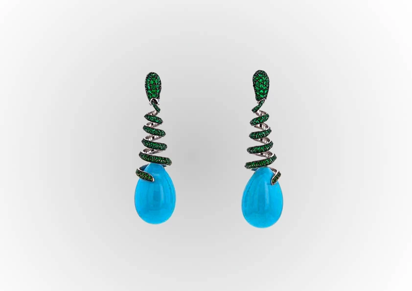 DescriptionThe De Grisogono pendant earrings with turquoise cabochons and emeralds are crafted in a gorgeous twist of white gold setting and blackened gold delicately set with round emeralds, and turquoise gemstones These earrings are perfect for adding a pop of color to any outfit and creates a unique and eye-catching look. |