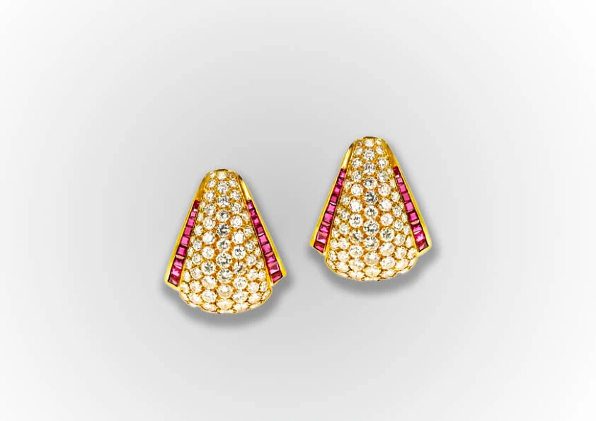 DescriptionThe Van Cleef & Arpels' 18 Karat Yellow Gold Diamond and Ruby Cocktail Earrings date back to the 1960s. These earrings feature a unique design with diamonds and rubies set in yellow gold, they are perfect for adding a touch of elegance to any outfit and are sure to be a conversation starter. |