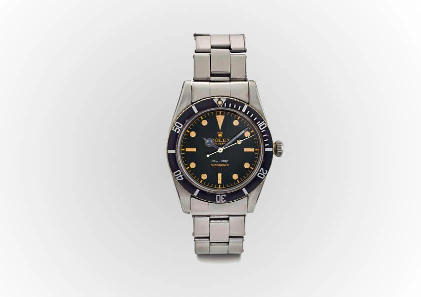 This model is one of the last to retain the iconic features of the original Submariner models. This watch has no crown protector. It is distinguished from the other "no crown protector" references by its 6 mm screwed crown, which is significantly smaller than the ones on the other references. This is also the last Submariner that can withstand water pressures of up to 100 meters. The following models are water resistant up to 200 meters.