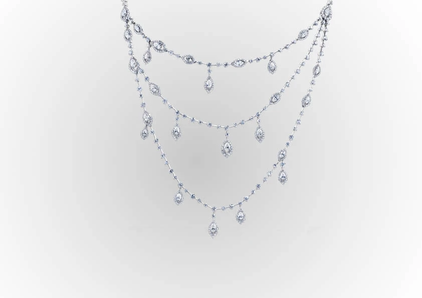 DescriptionThe inspiration behind this masterpiece stems from childhood memories of carefree summers spent picking petals from daisies. Crafted in 18 carat white gold, the three-row Le Jardin Wildflower necklace features three uniquely designed round diamond chains, artfully layered at different lengths. This stunning design adds depth and dimension to your neckline, creating a truly mesmerizing effect. As you adorn yourself with this necklace, you'll notice the pear-shaped and marquise diamond petals, meticulously outlined in micro-set stones. The arrangement of these petals adds an asymmetric touch, infusing the necklace with a sense of playfulness and joy. Every time you wear it, you'll be reminded of the whimsical beauty of nature. Indulge in the enchantment of our WILD FLOWER NECKLACE, THREE-ROW. Let its captivating design transport you to a world of everlasting beauty, where the allure of flowers never fades. Elevate any outfit with this stunning necklace and let its elegance and charm make a statement wherever you go. |