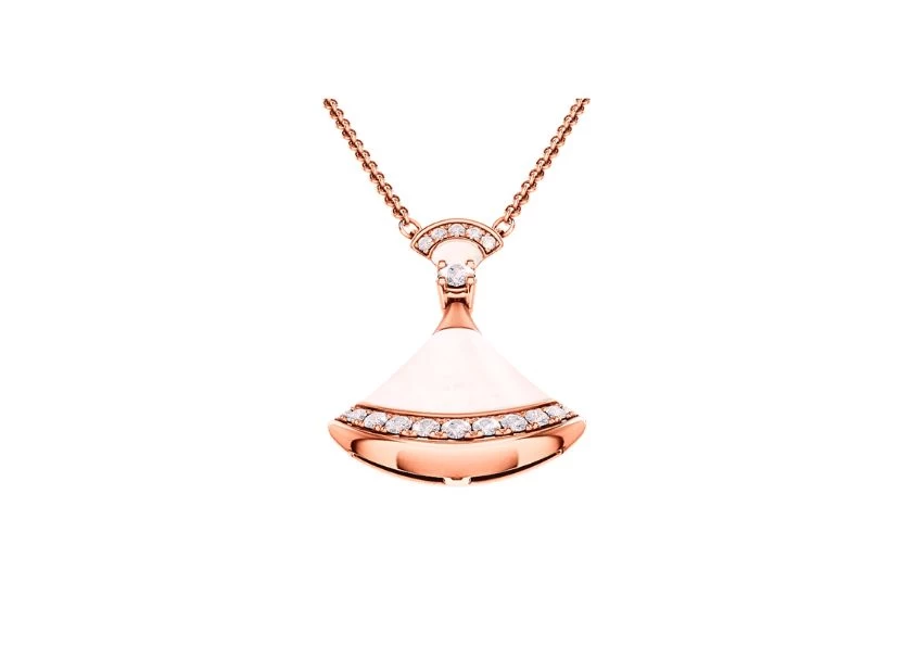Crafted with utmost precision, the DIVAS' DREAM necklace is a stunning combination of 18 kt rose gold, mother of pearl inserts, and a mesmerizing round brilliant-cut diamond. The pavé diamonds further enhance its luxurious appeal, adding a touch of opulence and glamour to any ensemble.