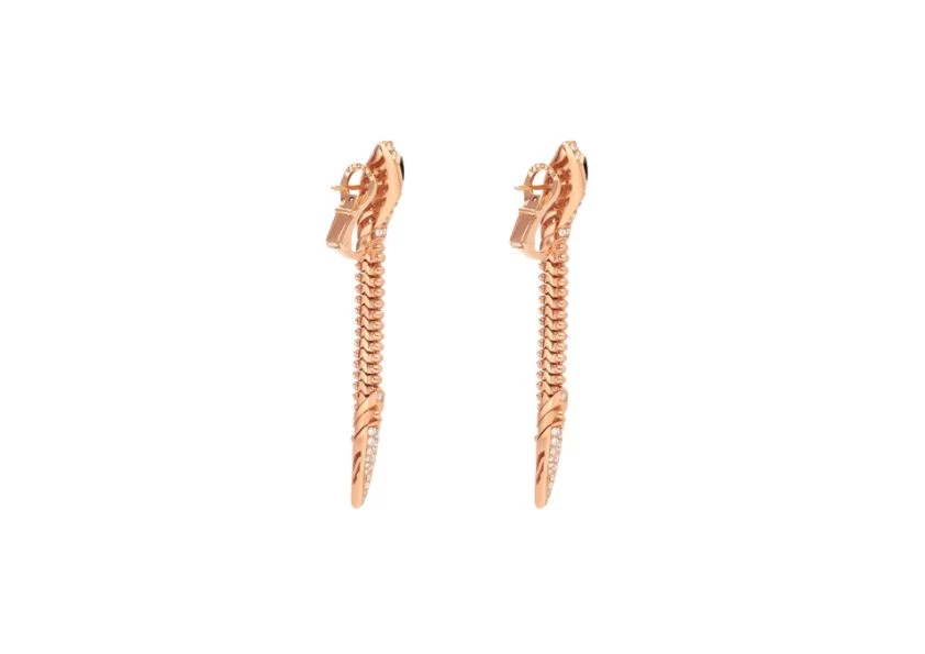 Crafted with meticulous attention to detail, the Serpenti earrings are a distinctive interpretation of Bulgari's renowned symbol of transformation and metamorphosis. The 18 kt rose gold beautifully showcases the snake's mesmerizing body, composed of delicate and movable gold beads that exude a sense of fluidity and tactile allure.