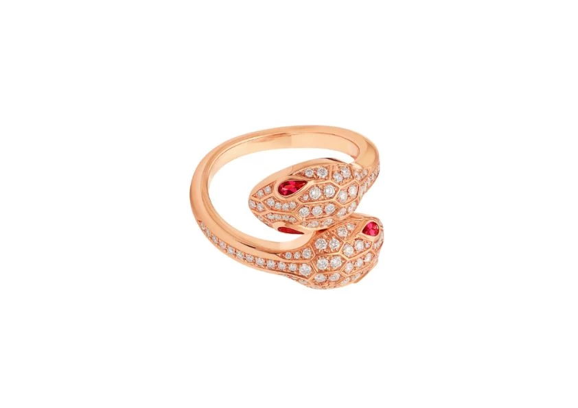 DescriptionIntroducing Preloved: Serpenti Seduttori 18 kt Rose Gold Double Head Ring Set with Rubellite Eyes and Pavé Diamonds - a truly captivating piece that exudes irresistible charm and glamour. |