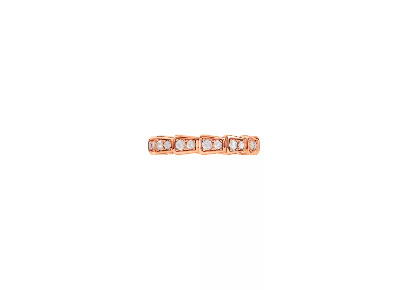 Introducing the Preloved: Serpenti Viper wedding band in 18 kt rose gold, adorned with a breathtaking display of full pavé diamonds. Prepare to be mesmerized as Bulgari pays homage to its spirit animal, capturing the essence of seduction within this exquisite piece.