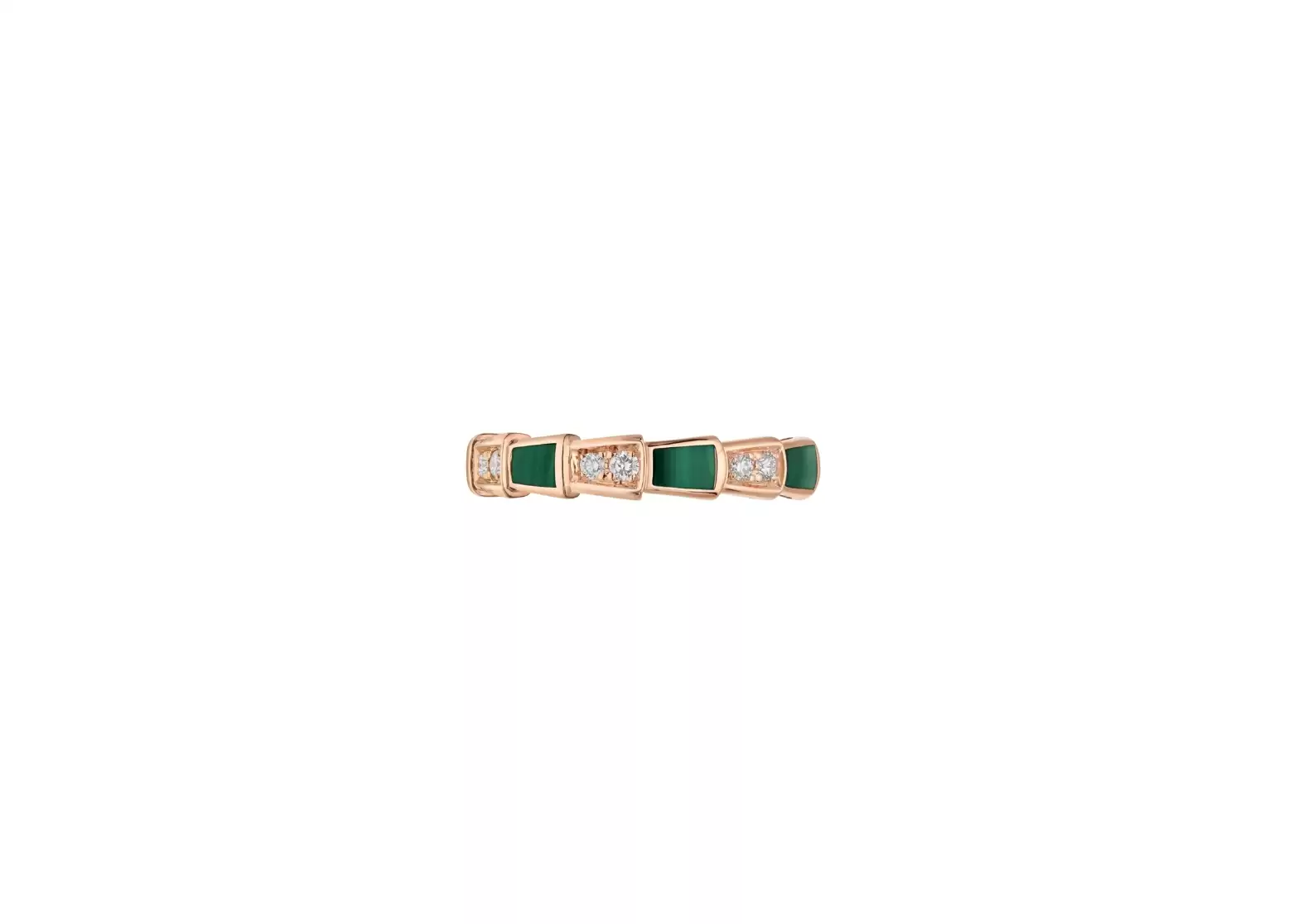 Introducing the Preloved:Serpenti Viper 18 kt rose gold thin ring set with malachite elements and pavé diamonds. Prepare to be enchanted by the mesmerizing beauty of this exquisite piece.