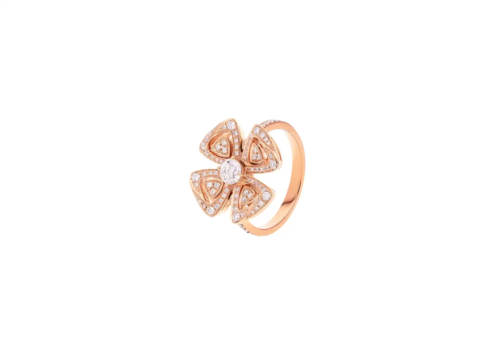 Reimagining the multifaceted beauty of nature, Bvlgari has crafted a precious floral icon that sparkles endlessly. Four rose gold and diamond petals delicately embrace a central diamond, creating a breathtaking symphony of light and beauty. Each diamond is meticulously chosen to ensure unparalleled brilliance and radiance.