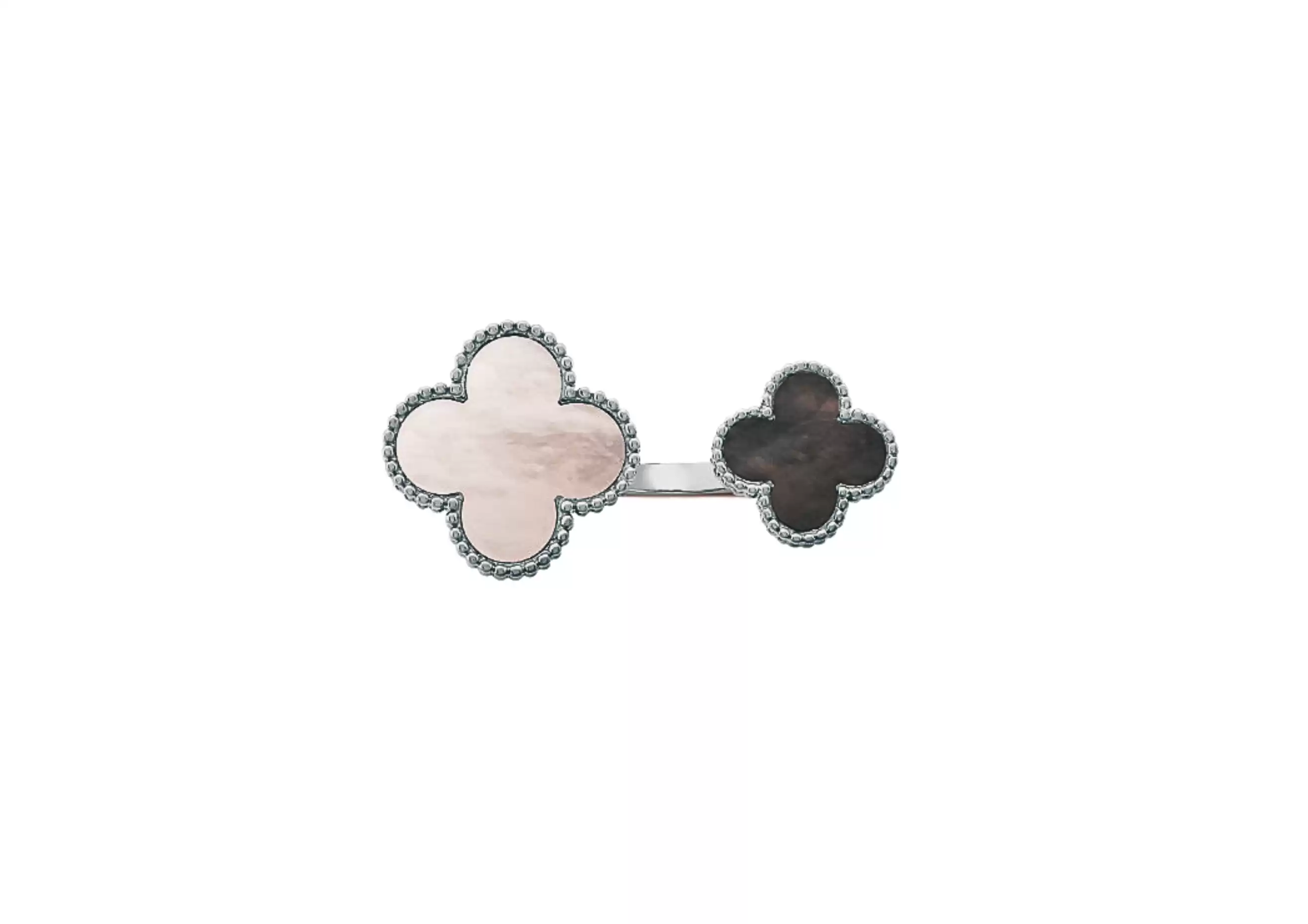 Indulge in the allure of this rhodium plated 18K white gold ring, adorned with exquisite white and gray mother-of-pearl stones. Experience the magic of Van Cleef & Arpels and embrace the uniqueness of each creation. Elevate your style and make a lasting impression with this extraordinary piece.