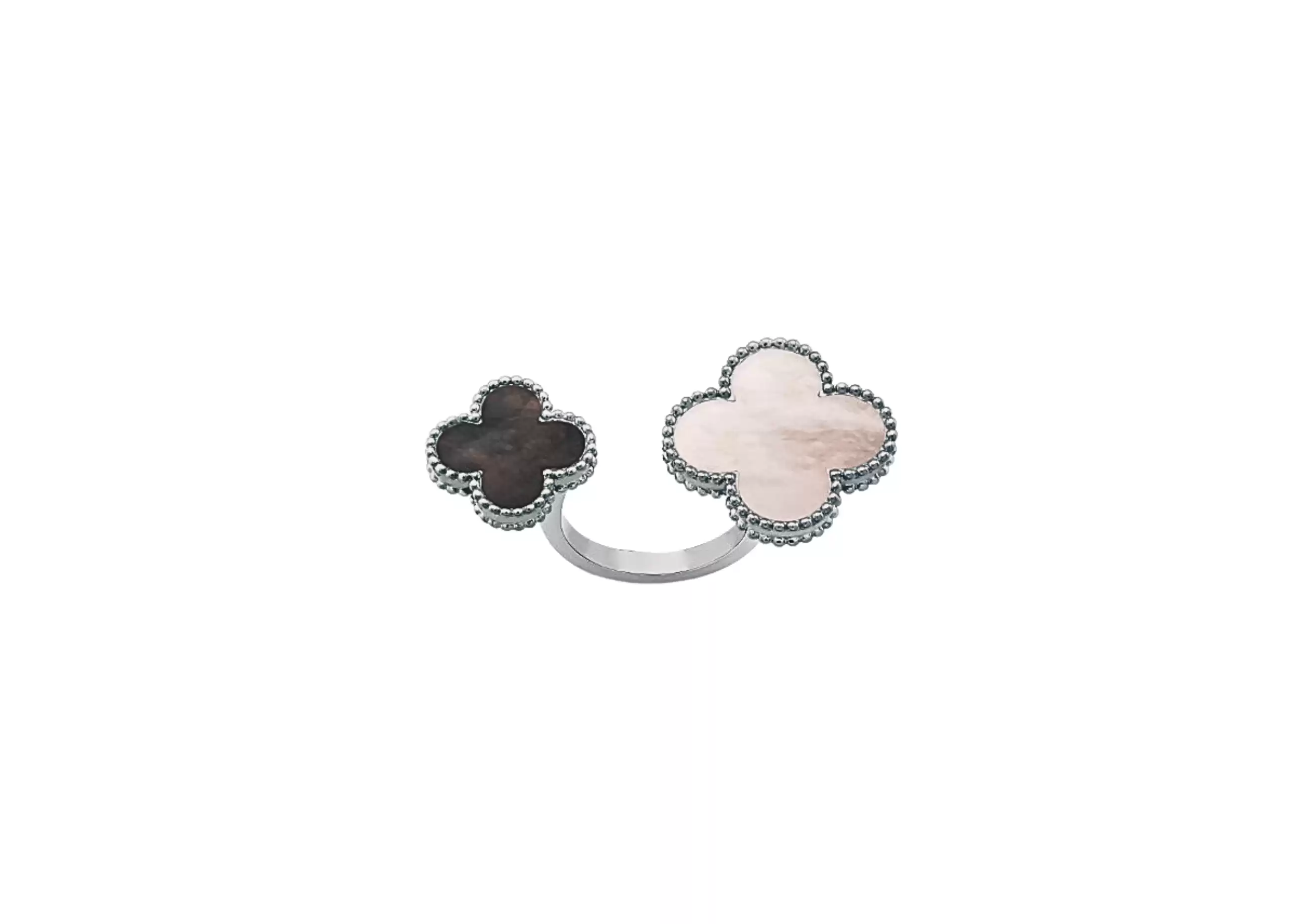 The focal point of this enchanting ring lies in its captivating stones - two mesmerizing mother-of-pearl stones. Each stone possesses its own unique color and features, ensuring that no two creations are alike. The combination of white and gray mother-of-pearl adds a touch of ethereal beauty to this already enchanting piece.