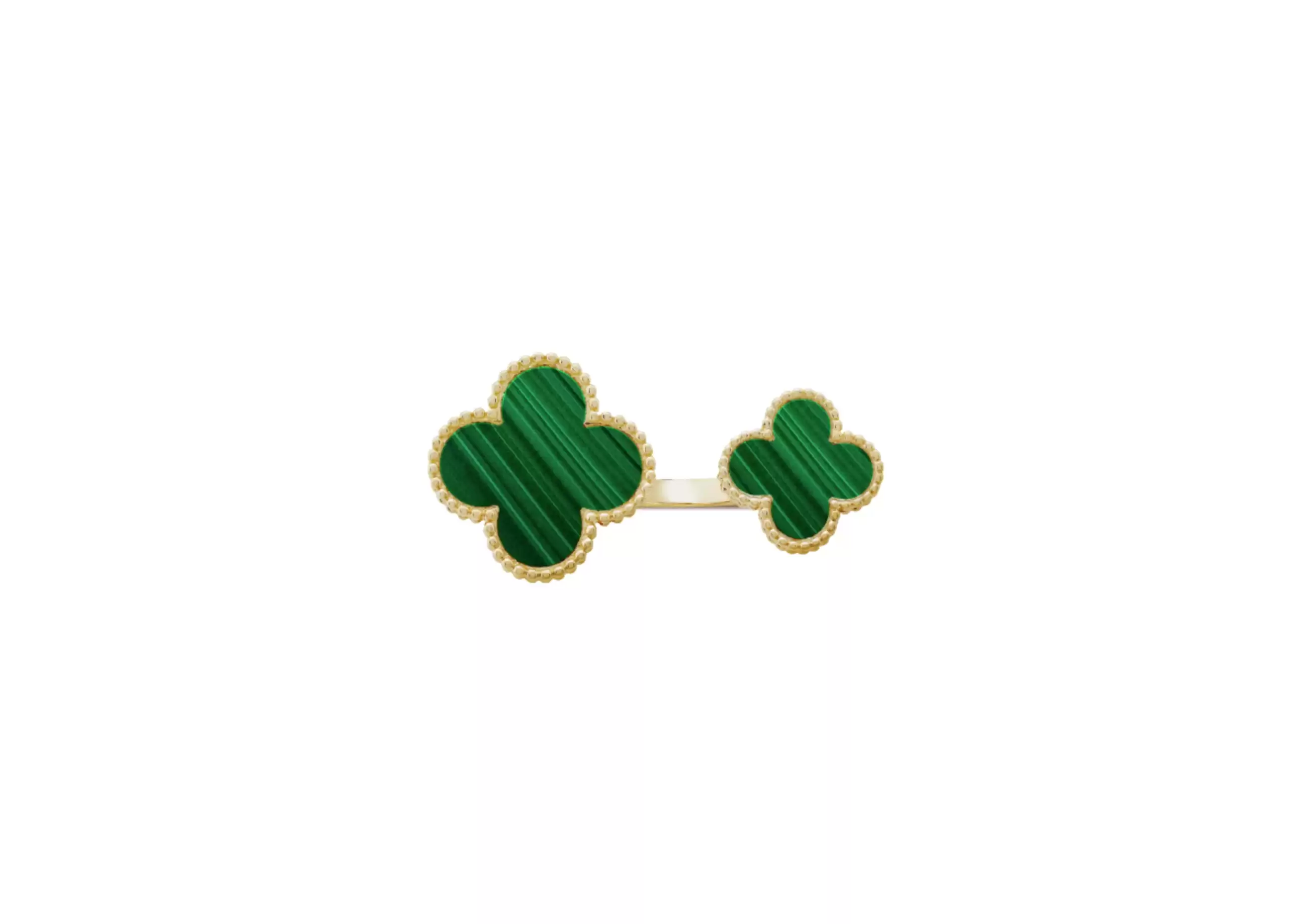 The Magic Alhambra Between the Finger ring features two malachite stones, each showcasing its own unique color and distinctive features. As a result, every creation is truly one-of-a-kind, ensuring that you will own a truly exclusive piece of jewelry.