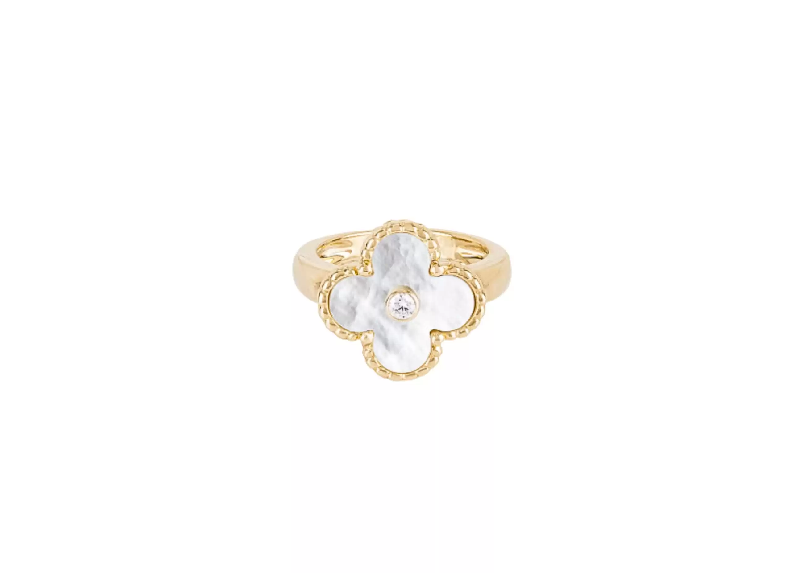 With its timeless design and impeccable craftsmanship, this Vintage Alhambra ring is a true statement piece. The delicate white mother-of-pearl adds a touch of elegance, while the round diamond sparkles with every movement.