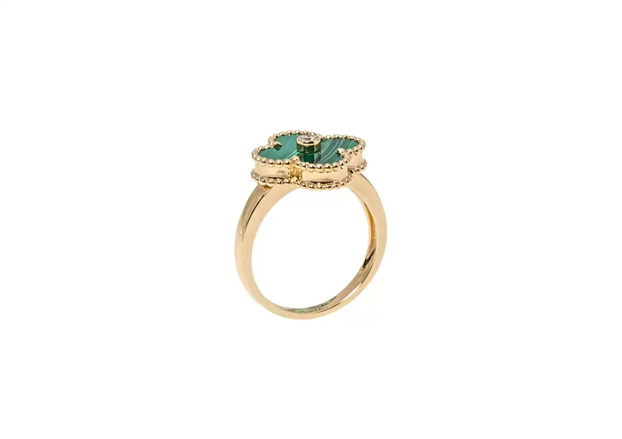 Accompanying the diamond is a luscious malachite stone, adding a unique and vibrant touch to the ring. As each stone is one-of-a-kind, its color and features may vary from one creation to another, ensuring that your piece is truly unique and special.