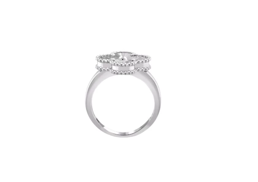 The Vintage Alhambra ring is a true testament to Van Cleef & Arpels' renowned craftsmanship and expertise. Its sleek and luxurious 18K white gold band complements the intricate detailing, creating a harmonious blend of classic and contemporary elements.