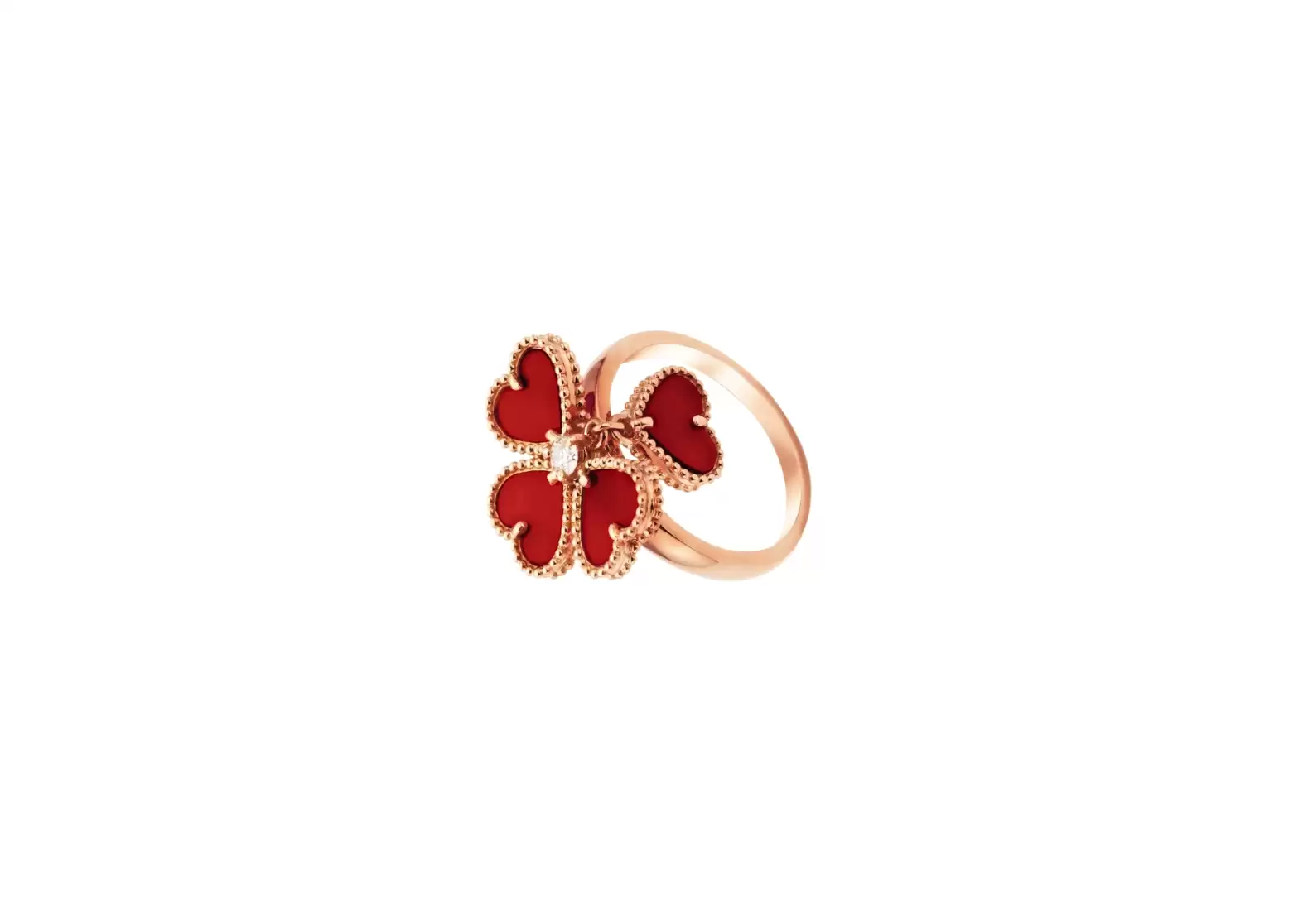 Introducing the exquisite Preloved: Sweet Alhambra Effeuillage Ring by Van Cleef & Arpels. Crafted with utmost precision and elegance, this stunning ring is made of 18K rose gold, adorned with carnelian and a round diamond of exceptional quality.