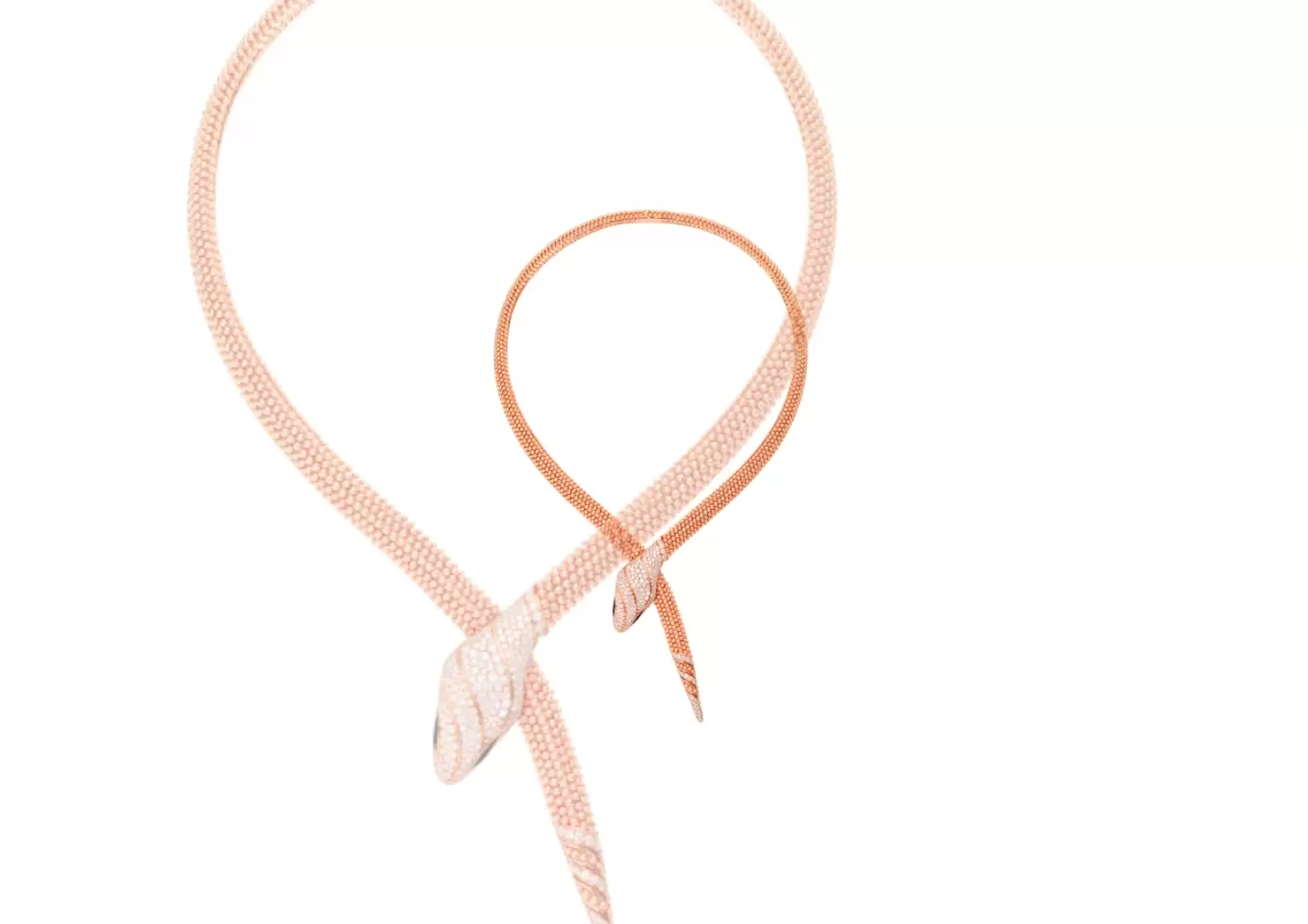 Crafted with meticulous attention to detail, the snake's precious body is artfully made of mobile small gold beads, creating a mesmerizing sense of movement and tactile appeal. The necklace's sinuous head and tail are elegantly adorned with pavé diamonds, adding a touch of mesmerizing sparkle.