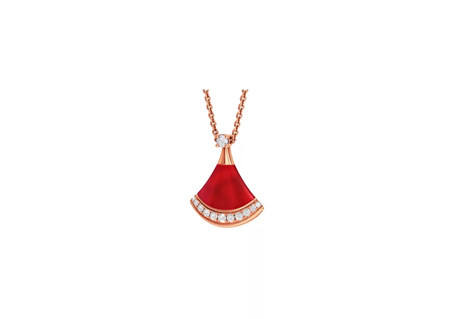 Indulge in the exquisite allure of the Divas Dream necklace with pendant in 18 kt rose gold, a true masterpiece that embodies the essence of joyful femininity. This captivating necklace presents a vibrant interpretation of the iconic fan-shaped motif, showcasing Bulgari's unrivaled craftsmanship and commitment to timeless elegance.