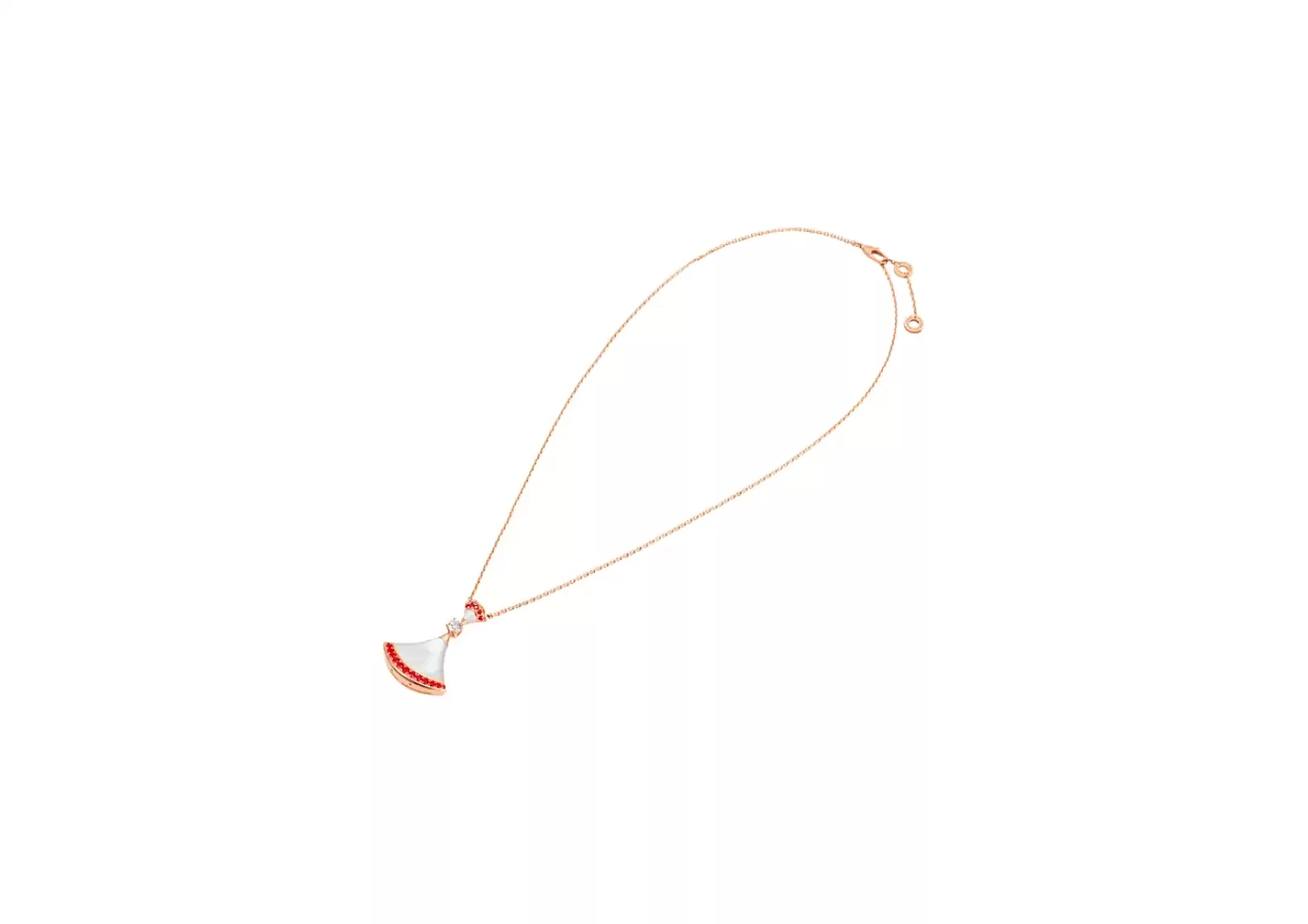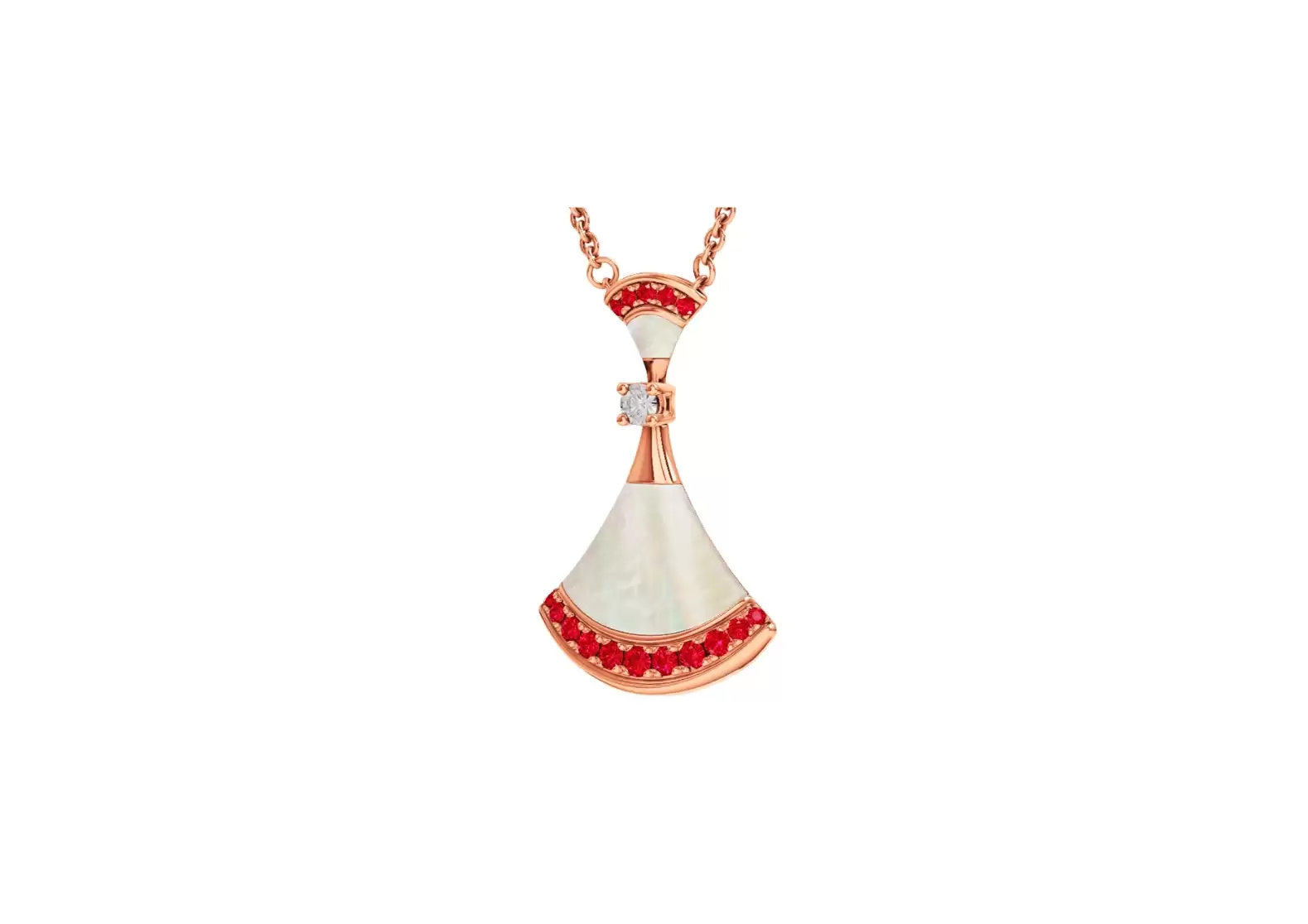 Introducing the Divas`Dream 18kt Rose Gold Necklace Set with Mother of Pearl Elements, Brilliant-Cut Diamond, and Pavé Rubies. Prepare to be captivated by the sheer elegance and irresistible charm of this exquisite piece, inspired by the eternal allure of the Eternal City.