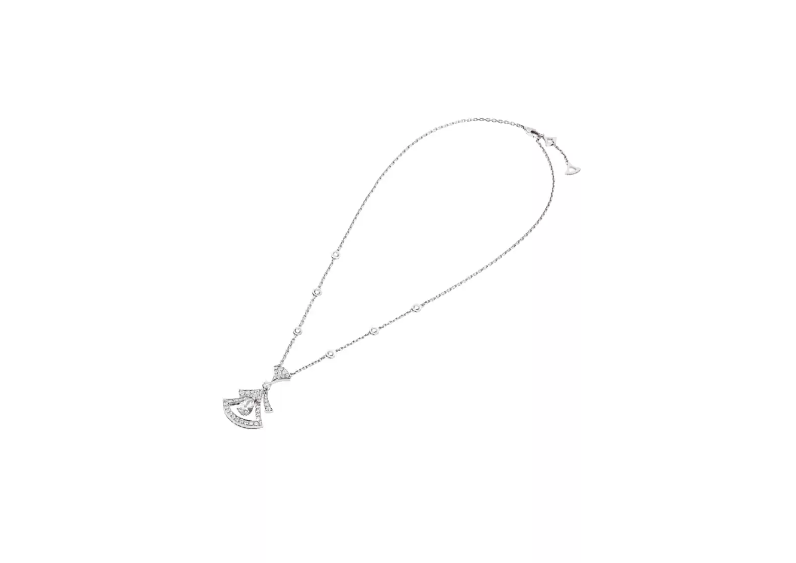 The necklace's design is inspired by the breathtaking mosaics found in the Roman Baths of Caracalla, showcasing a fan-shaped motif that exudes femininity and refinement. Crafted with meticulous attention to detail, the intricate openwork elements delicately play with light, creating an enchanting dance of shadows and brilliance.