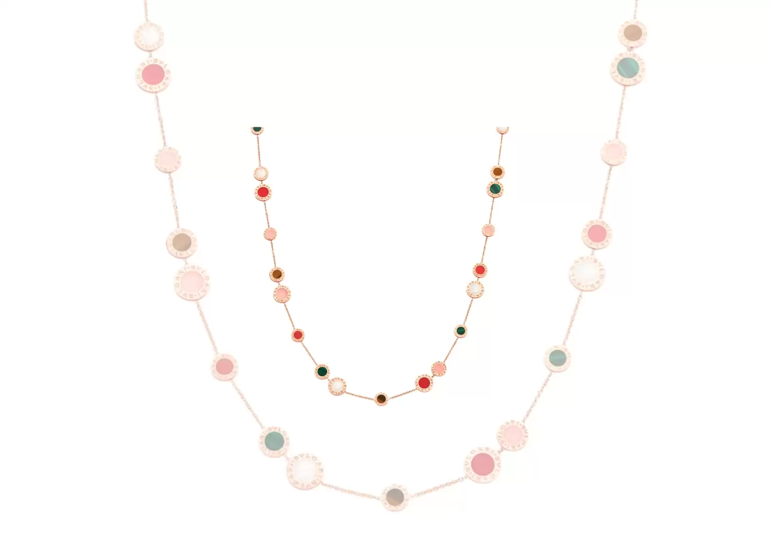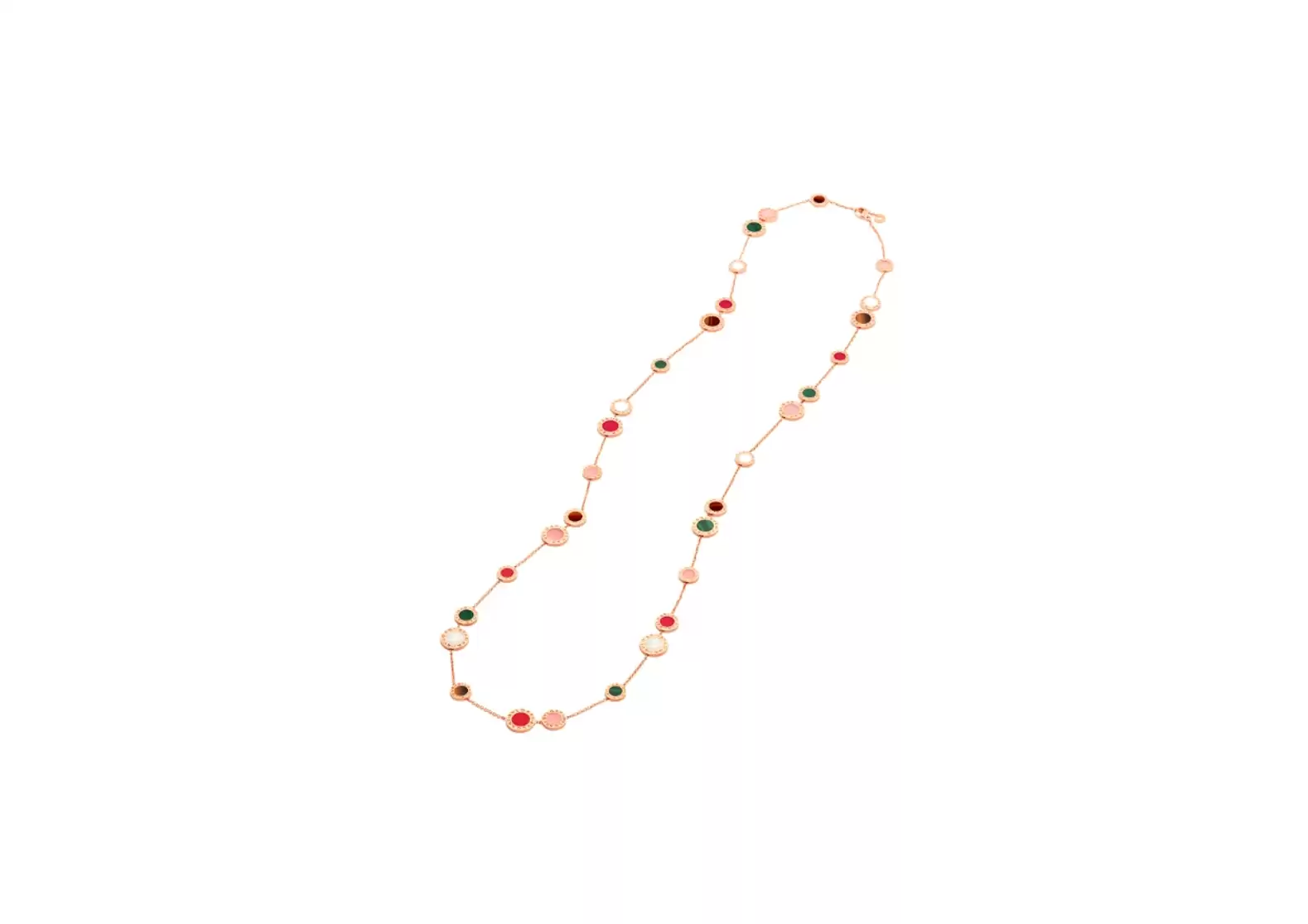 Introducing the exquisite 18 kt rose gold sautoir set with mother-of-pearl, pink opal, tiger's eye, malachite, and carnelian elements from Bvlgari. This stunning piece is a true testament to the brand's Roman heritage, while exuding an elegant and modern charm.