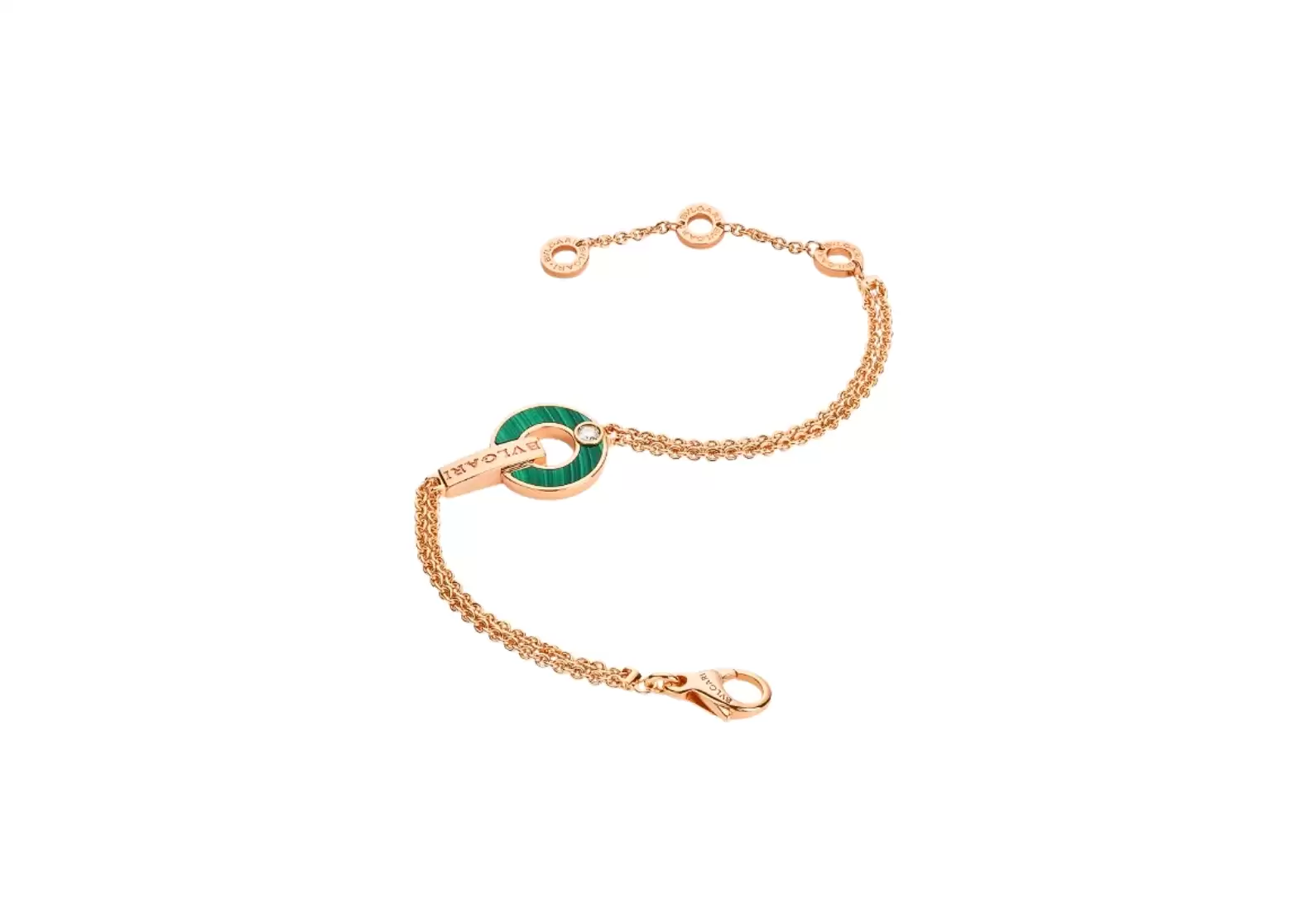 Introducing the exquisite Openwork 18 kt rose gold bracelet, adorned with mesmerizing malachite elements and a dazzling round brilliant-cut diamond. This remarkable piece is a testament to Bvlgari's rich Roman heritage, seamlessly merging tradition with a contemporary twist.