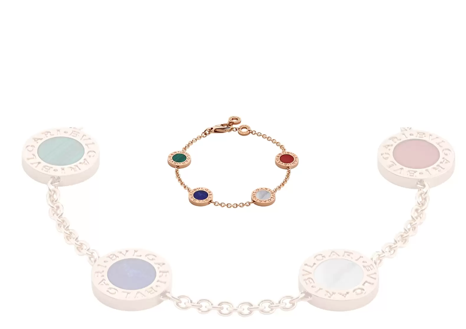 Introducing the exquisite BVLGARI 18 kt rose gold bracelet set with carnelian, lapis, malachite, and mother of pearl elements. This stunning piece transcends time, blending the rich heritage of Rome with a touch of modernity, resulting in a truly captivating fusion of culture and elegance.
