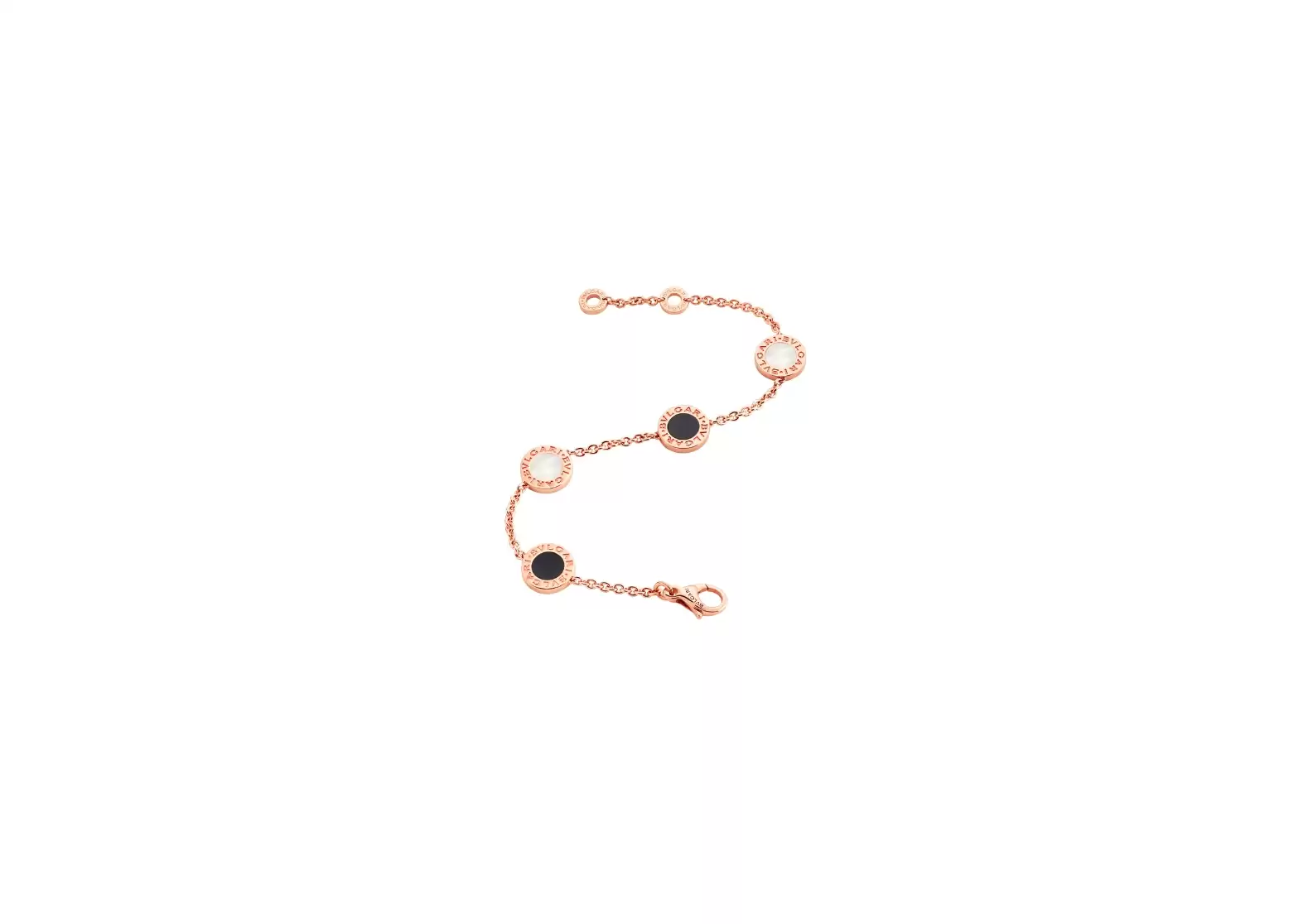 Introducing the Bvlgari Bvlgari bracelet, a true embodiment of sophistication and style. Crafted with utmost precision in 18 kt rose gold, this exquisite piece is adorned with captivating mother-of-pearl and onyx elements.
