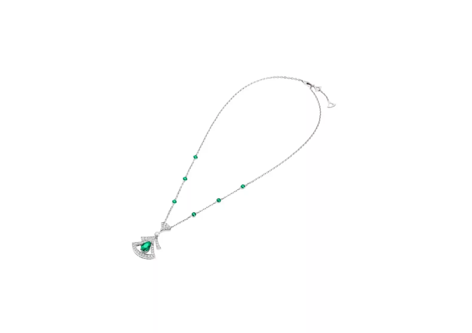 The Divas`Dream necklace features a pear-shaped emerald, round brilliant-cut emeralds, a round brilliant-cut diamond, and pavé diamonds. These exquisite gemstones add a touch of luxury and sophistication, elevating the necklace to new heights of elegance.