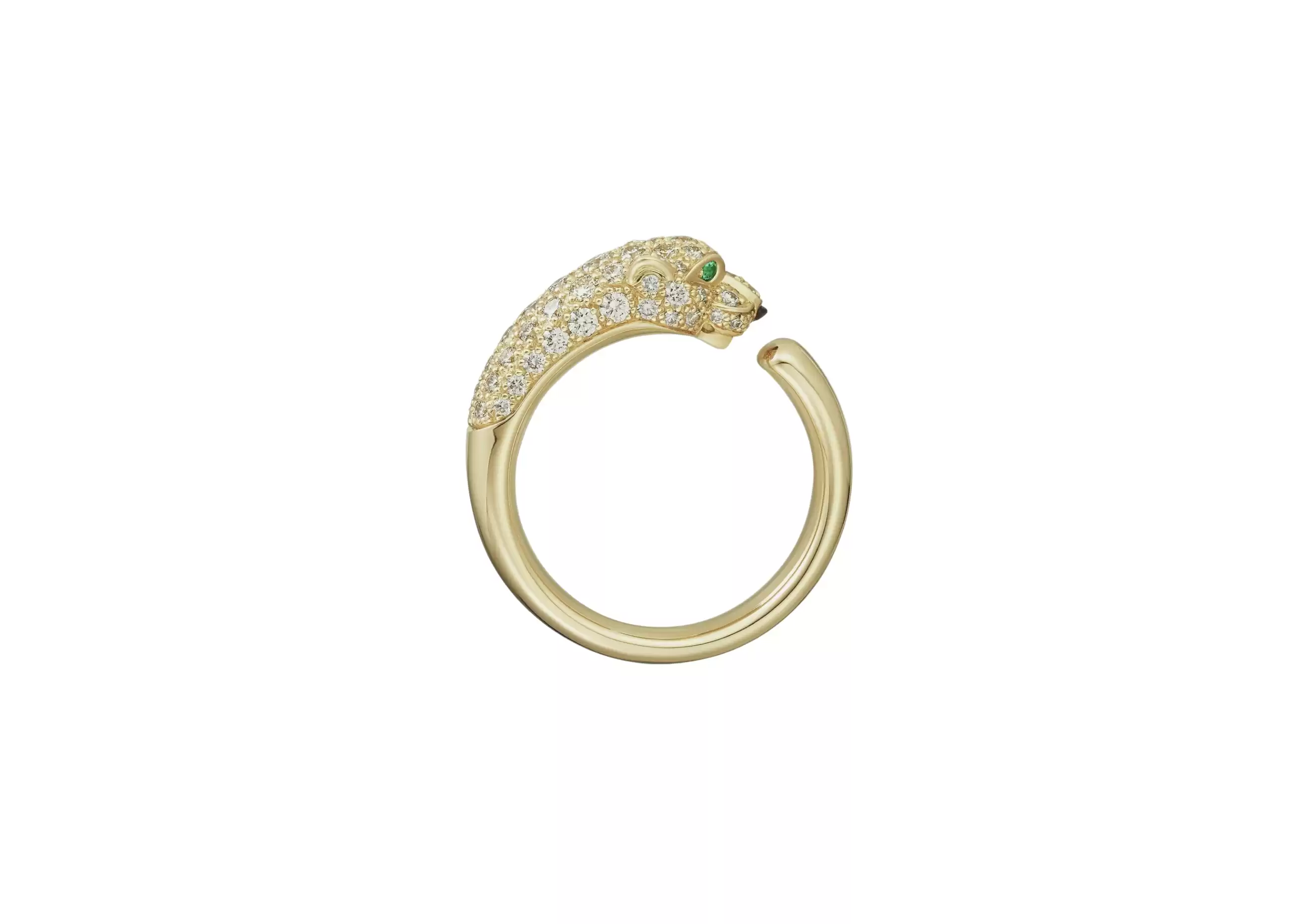 Meticulously designed, the Panthère de Cartier ring boasts a radiant yellow gold composition of 750/1000, exuding a timeless allure. Its captivating allure is further enhanced by the inclusion of two mesmerizing emeralds, delicately set amidst a sea of 72 brilliant-cut diamonds, totaling an impressive 0.68 carats.