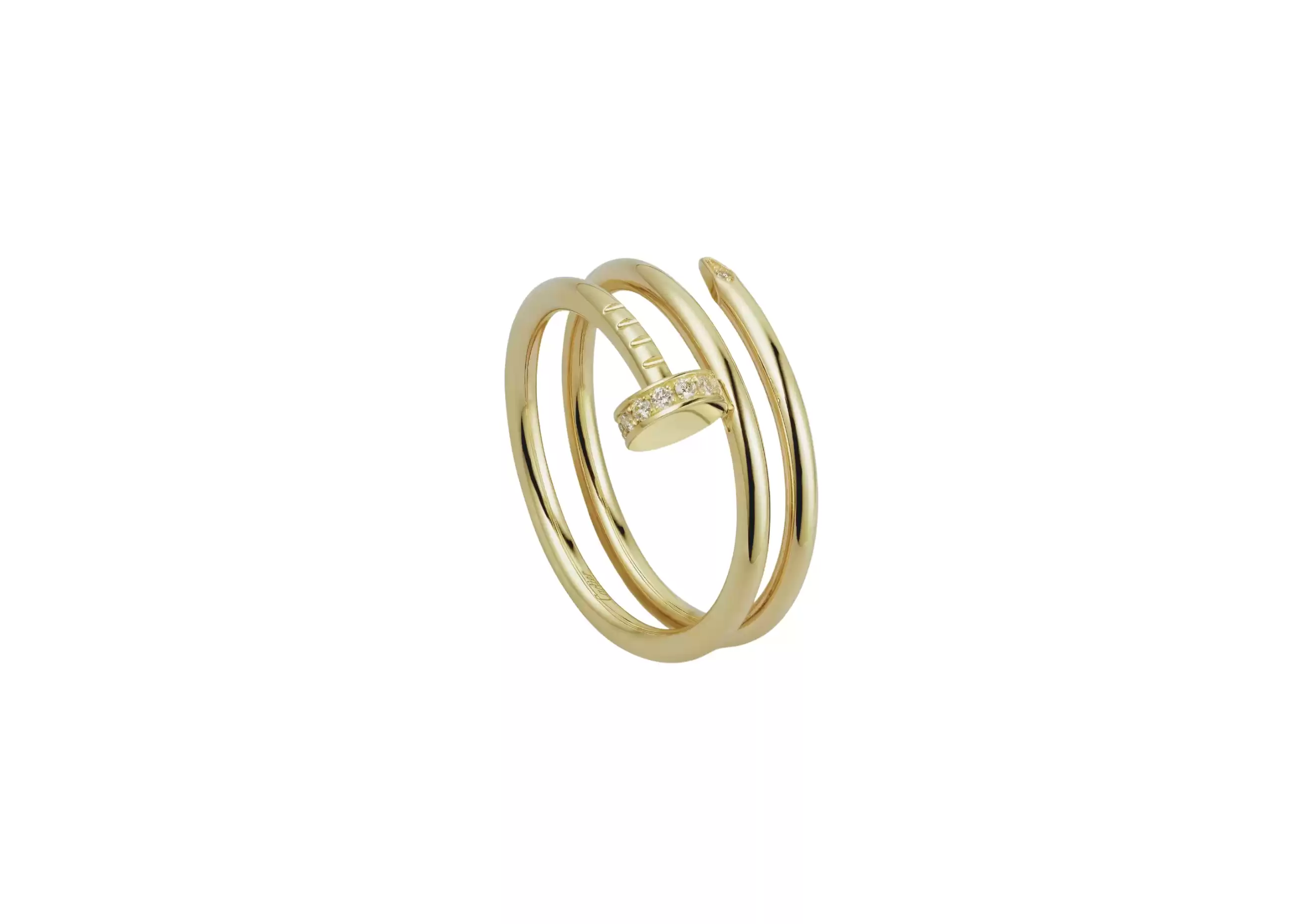 Meticulously designed, the Juste un Clou ring is expertly crafted from 750/1000 yellow gold, ensuring its enduring quality and luxurious appeal. Adorned with 14 brilliant-cut diamonds, totaling an impressive 0.08 carat, this ring exudes an enchanting radiance that captivates all who behold it.