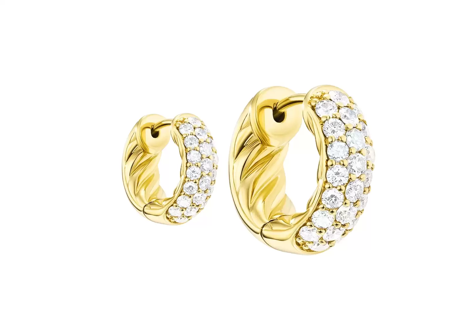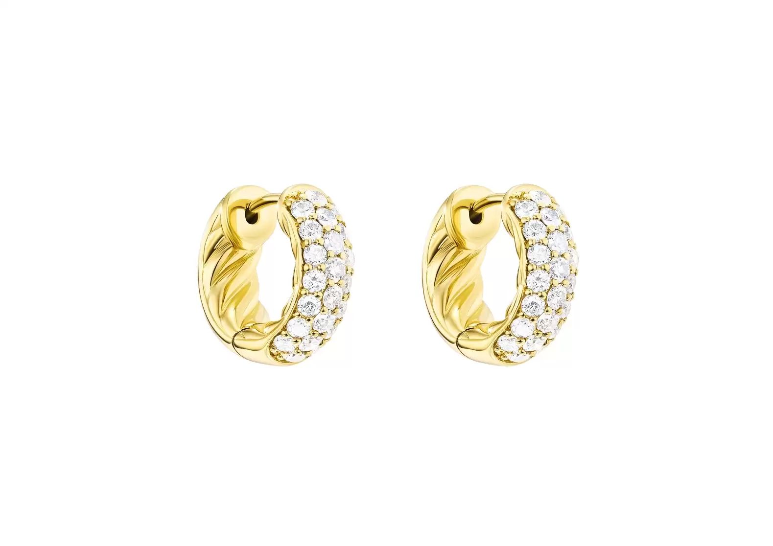 Made from 18-karat yellow gold, these earrings exude a timeless charm that effortlessly complements any outfit or occasion. The pavé-set diamonds, totaling an impressive 0.96 carats, add a dazzling sparkle that catches the light from every angle.