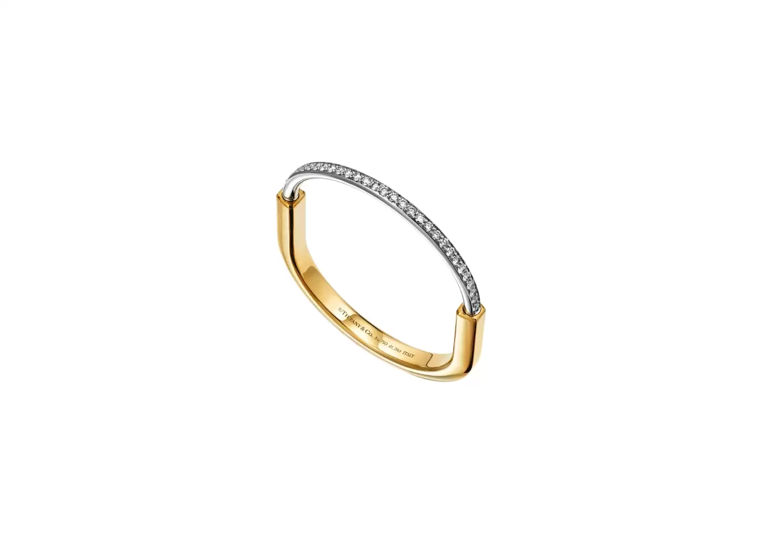 Introducing the Preloved: Tiffany Lock Bangle in Yellow and White Gold with Half Pavé Diamonds I 70181142. This exquisite piece is inspired by the power of togetherness and inclusivity, serving as a visual representation of the personal bonds that shape our identities. Designed to be worn by all genders, the Tiffany Lock bangle showcases a unique clasp reminiscent of a padlock, an iconic symbol from The Tiffany Archives.