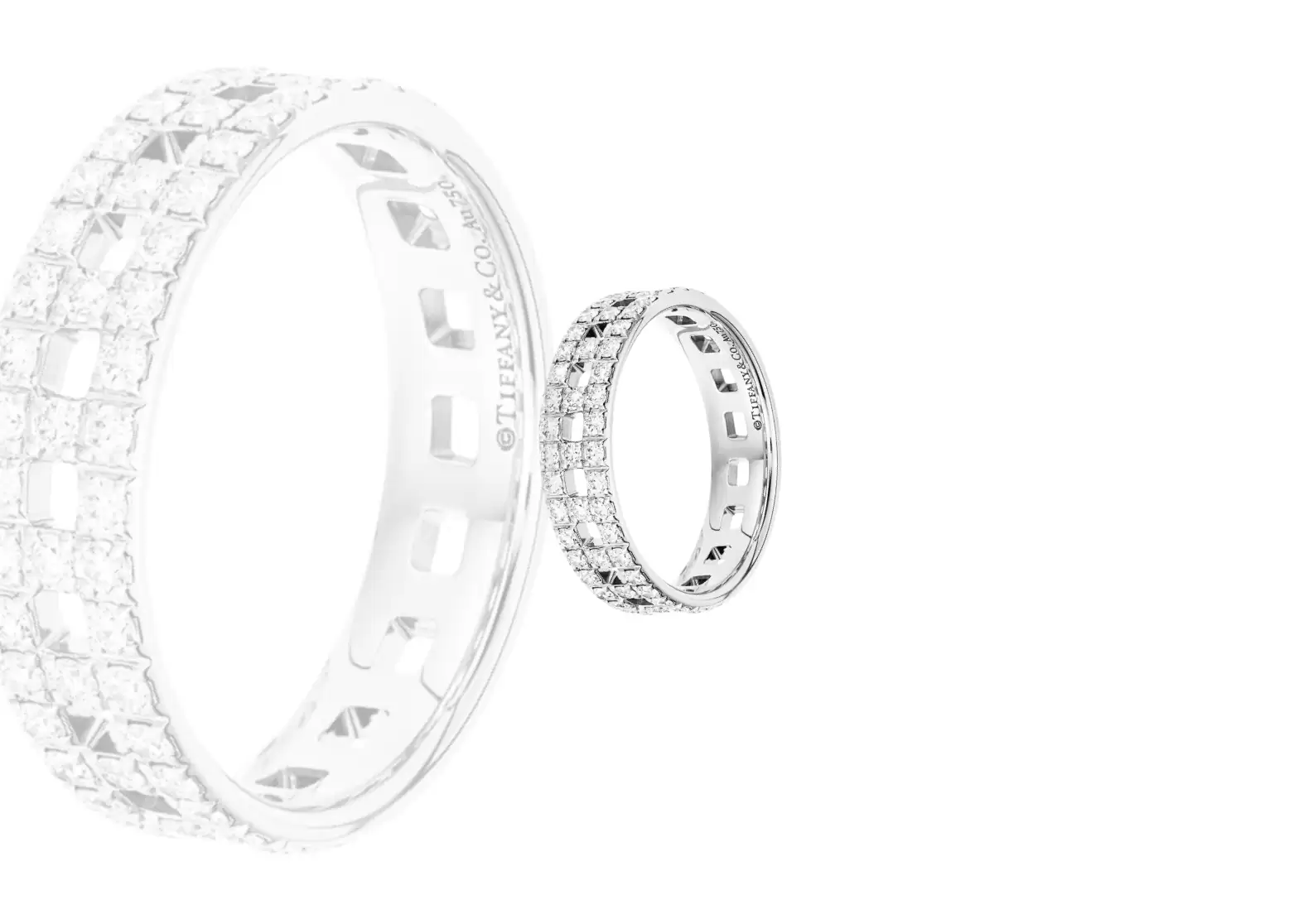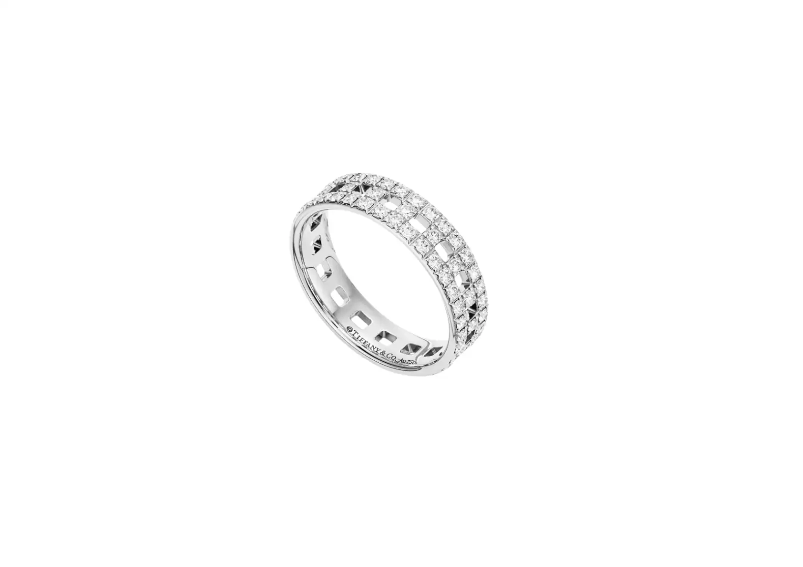 Crafted with utmost precision, this ring boasts alternating links that boldly display the iconic letter T, delicately traced with dazzling pavé diamonds. The meticulous arrangement of these sparkling gems adds a touch of brilliance and elegance to the overall design.