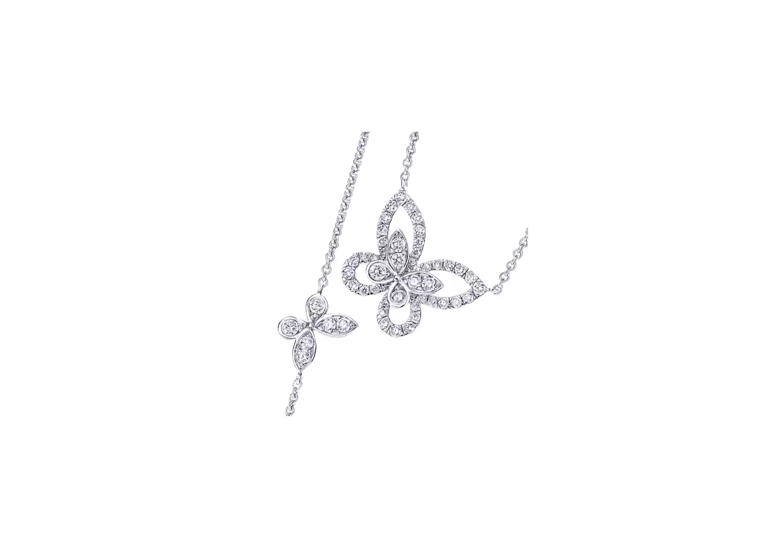 Expertly presented on a white gold chain, this necklace boasts a unique double-layer design that adds a subtle sense of three-dimensionality to the central butterfly motif. It is a true work of art that effortlessly combines elegance and style.