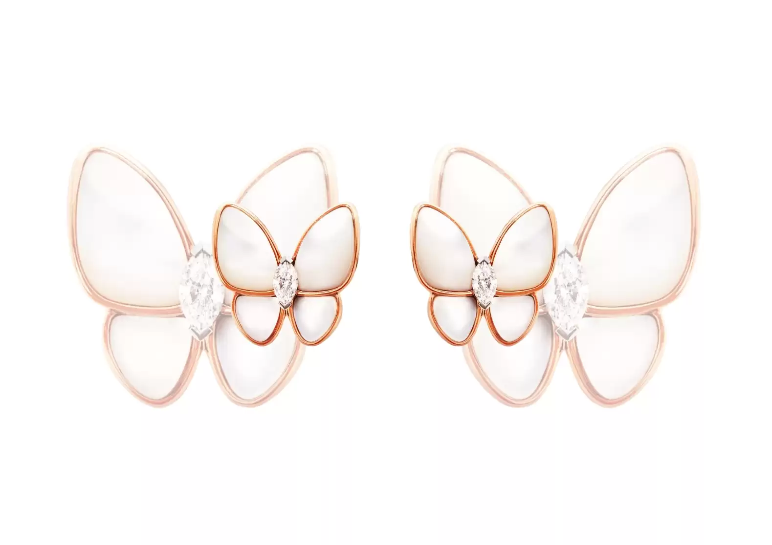 Made with 18K rose gold, these earrings exude a warm and enchanting glow that adds a touch of romance to any ensemble. The delicate white mother-of-pearl accents further enhance the allure of these earrings, creating a stunning contrast against the rose gold backdrop.