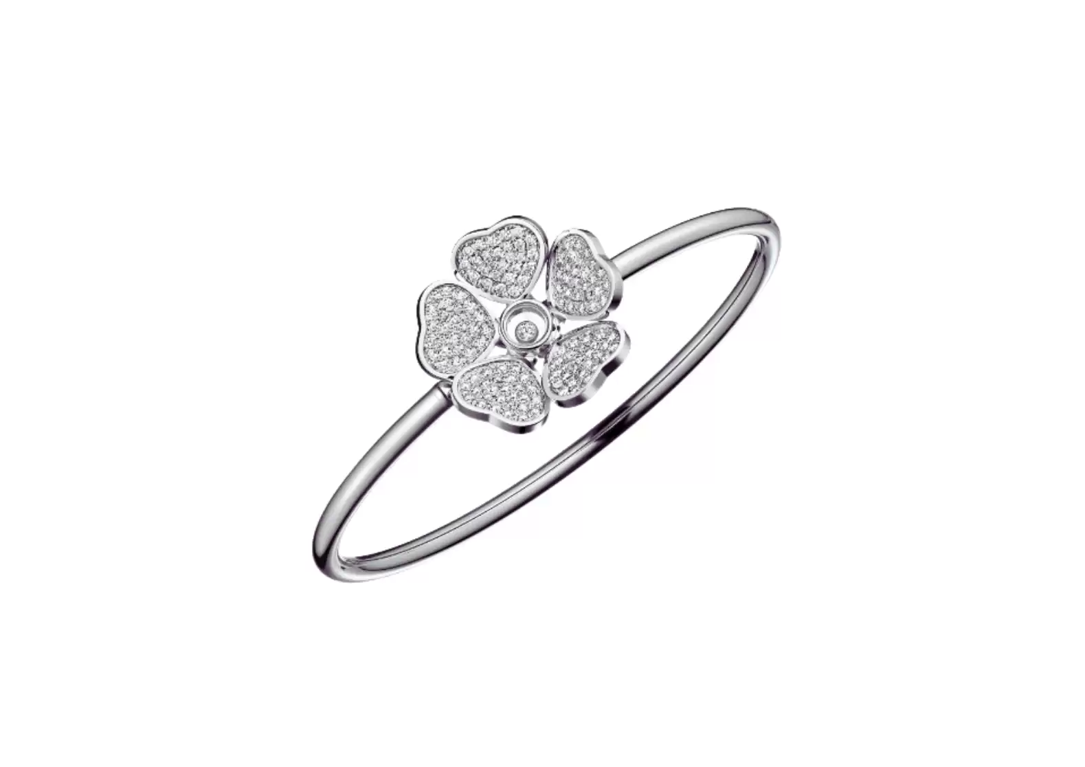 The Happy Hearts Flowers bangle showcases a stunning arrangement of five delicate hearts surrounding a dancing diamond, creating the illusion of delicate and feminine flowers. Crafted with 18-carat white gold, this bangle exudes luxury and sophistication.