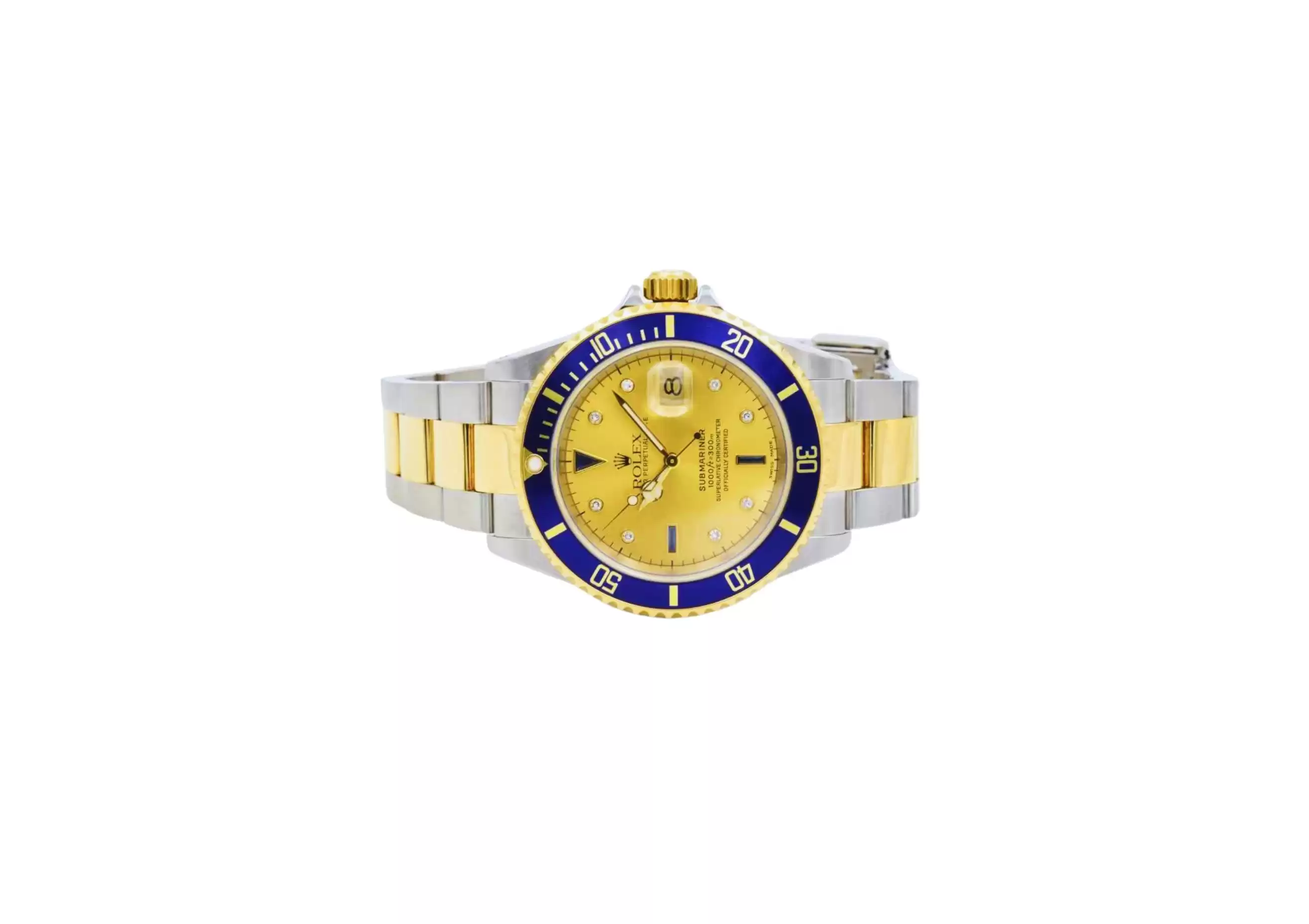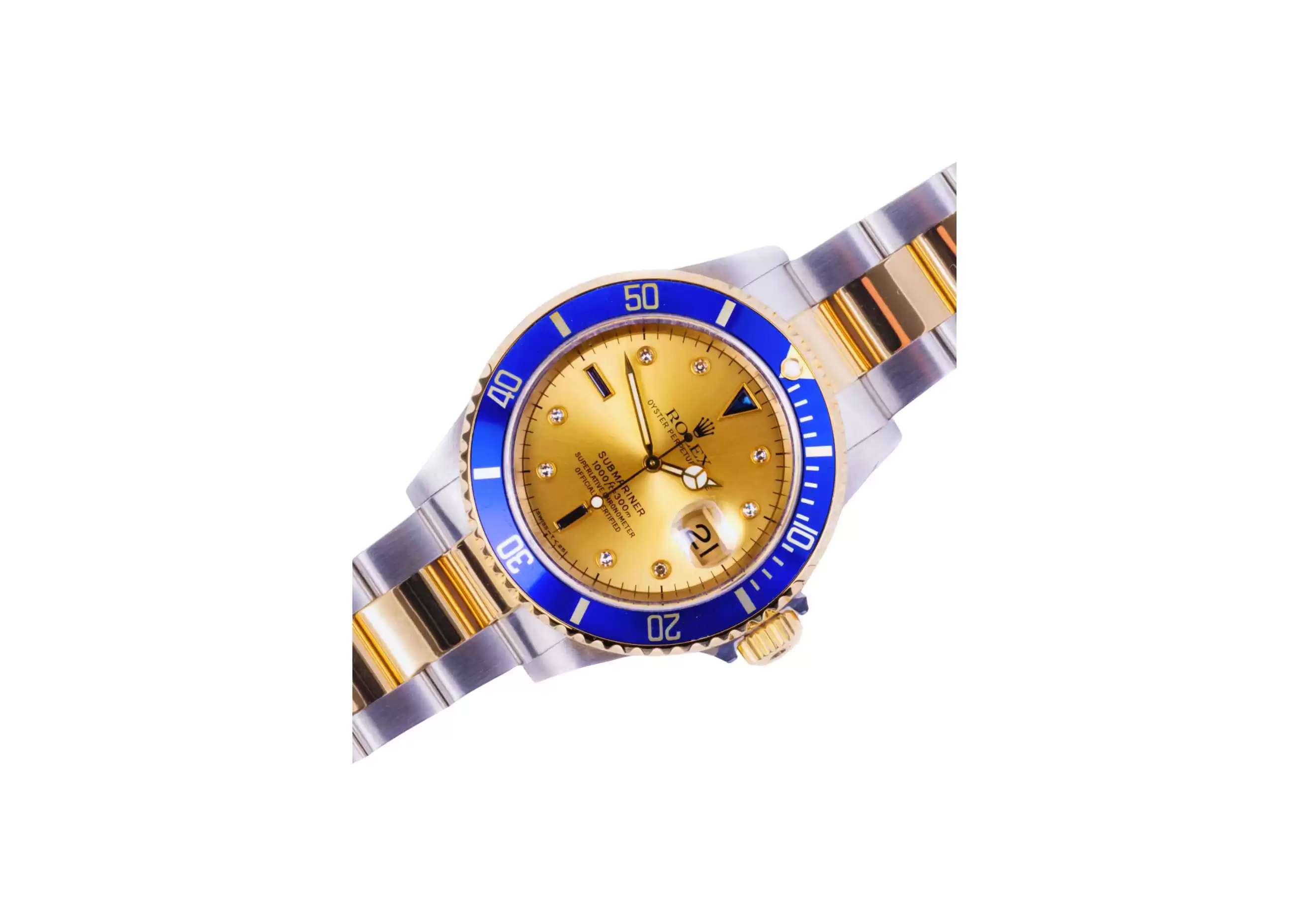 DescriptionIntroducing the exquisite Rolex Oyster Perpetual Submariner Date 16613 Mens Watch, a true testament to the brand's unrivaled craftsmanship and timeless elegance. Encased within a 40mm stainless steel case, this timepiece exudes a refined allure that is sure to captivate discerning gentlemen. The unidirectional rotating 18K yellow gold bezel, adorned with a striking blue insert, adds a touch of sophistication to the watch's design. Complementing this aesthetic is the champagne dial, featuring the iconic Mercedes gold luminous hands that effortlessly glide across its surface. The dial showcases original factory diamond set hour markers, further accentuated by three sapphire hour markers at the 6, 9, and 12 o'clock positions, creating a harmonious fusion of luxury and functionality. With minute markers adorning the outer dial and a convenient date display positioned at the 3 o'clock mark, this timepiece ensures utmost precision and practicality. The stainless steel and 18K yellow gold Oyster bracelet, secured with a stainless steel fold-over clasp with safety, not only enhances the watch's overall allure but also guarantees a comfortable fit for wrists up to 7 inches in circumference. Powered by an automatic self-winding movement, this Rolex Submariner Date 16613 Serti Dial Mens Watch exemplifies the brand's commitment to precision and reliability. Crafted in 1991, this timepiece carries with it a rich heritage and timeless appeal that will endure for generations to come. Indulge in the epitome of luxury and sophistication with the Rolex Oyster Perpetual Submariner Date 16613 Mens Watch, a true masterpiece that seamlessly blends style and functionality. |