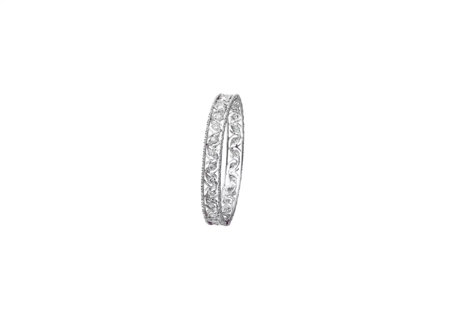 Introducing the exquisite Preloved: Ramage Bracelet in white gold, adorned with dazzling diamonds. This bangle bracelet showcases a mesmerizing openwork design, meticulously crafted in lustrous white gold. The intricate pattern is beautifully accentuated by leaf-modeled white gold borders, adding a touch of elegance to this stunning piece.