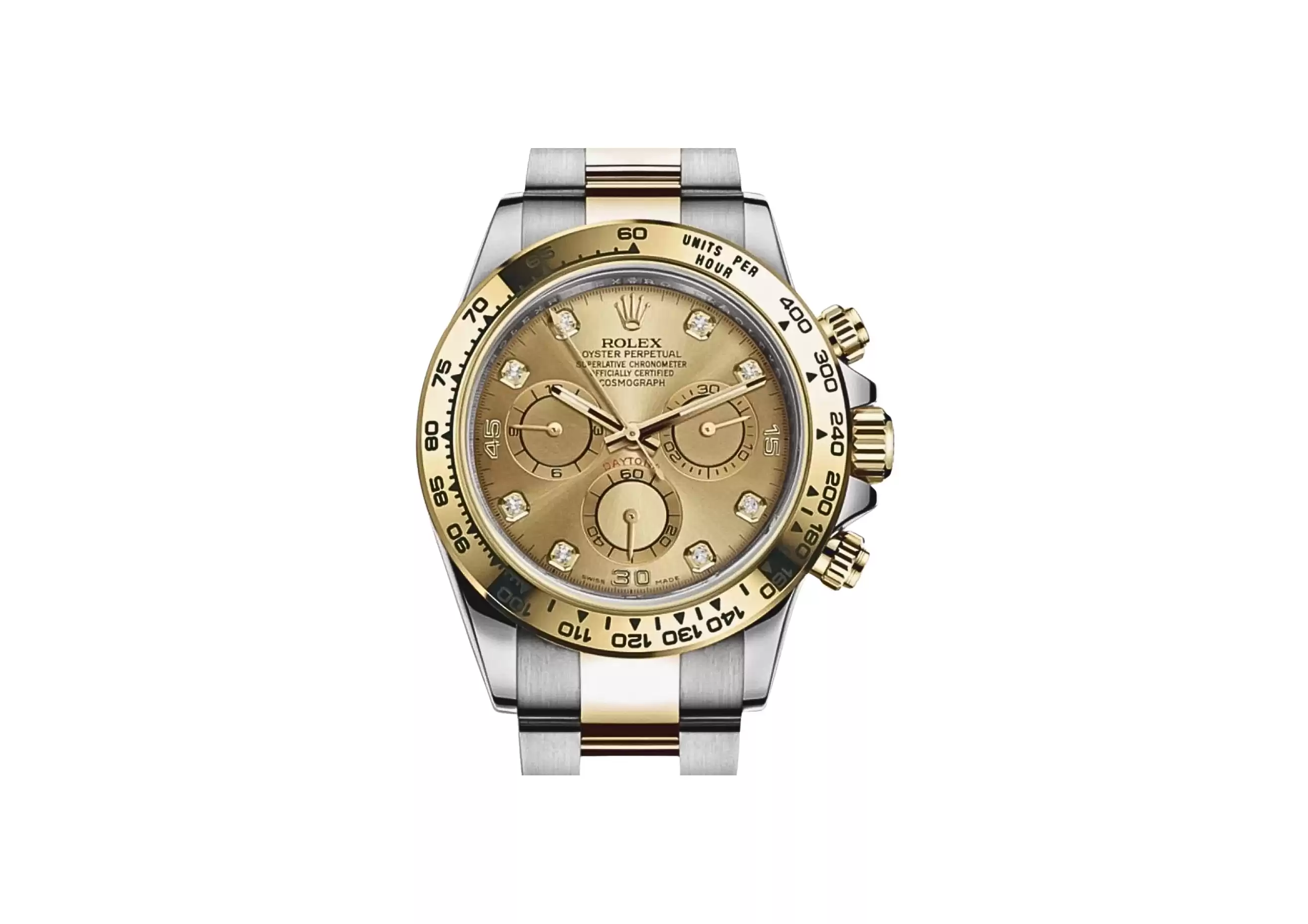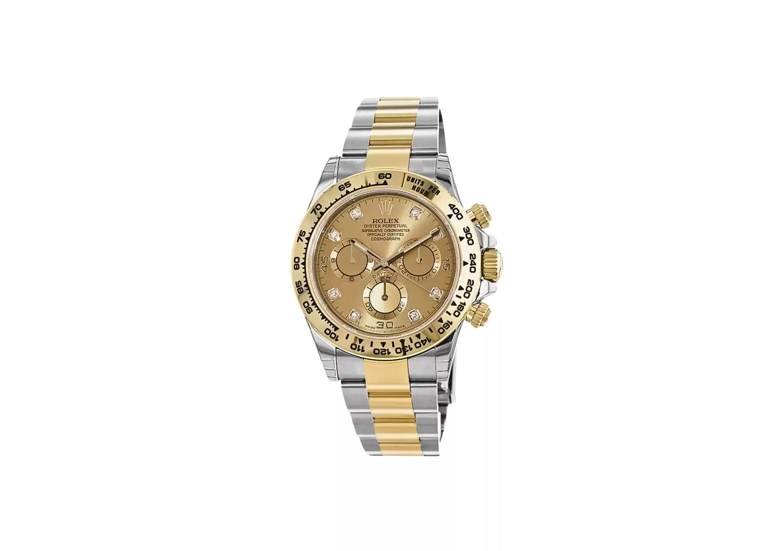DescriptionIntroducing the Pro-owned Rolex Daytona 116503, a timeless masterpiece that exudes elegance and sophistication. This exquisite timepiece comes with its original box and papers, ensuring its authenticity and adding to its allure. Crafted in the year 2019, this Rolex Daytona boasts a stunning champagne diamond dial that catches the light with every movement. The 40mm case, made from a combination of steel and yellow gold, showcases a seamless blend of strength and luxury. Powered by an automatic movement, this watch offers precision and reliability, making it the perfect companion for any occasion. The steel and yellow gold bracelet, known as the Oyster bracelet, adds a touch of refinement to the overall design. With a length of 16.5 cm, it ensures a comfortable fit on the wrist. With a water resistance of up to 100 meters, this Rolex Daytona is not only a symbol of style but also practicality. Whether you're diving into the depths or attending a formal event, this timepiece is built to withstand any adventure. As a testament to its quality, this Pro-owned Rolex Daytona comes with a 1-year remaining manufacturer warranty, giving you peace of mind and assurance. Additionally, Watchfinder provides an extended 24-month warranty, ensuring your investment is protected. Located conveniently, you are invited to call and view this remarkable timepiece in person. Don't miss the opportunity to own a piece of horological excellence with the Pro-owned Rolex Daytona 116503. |