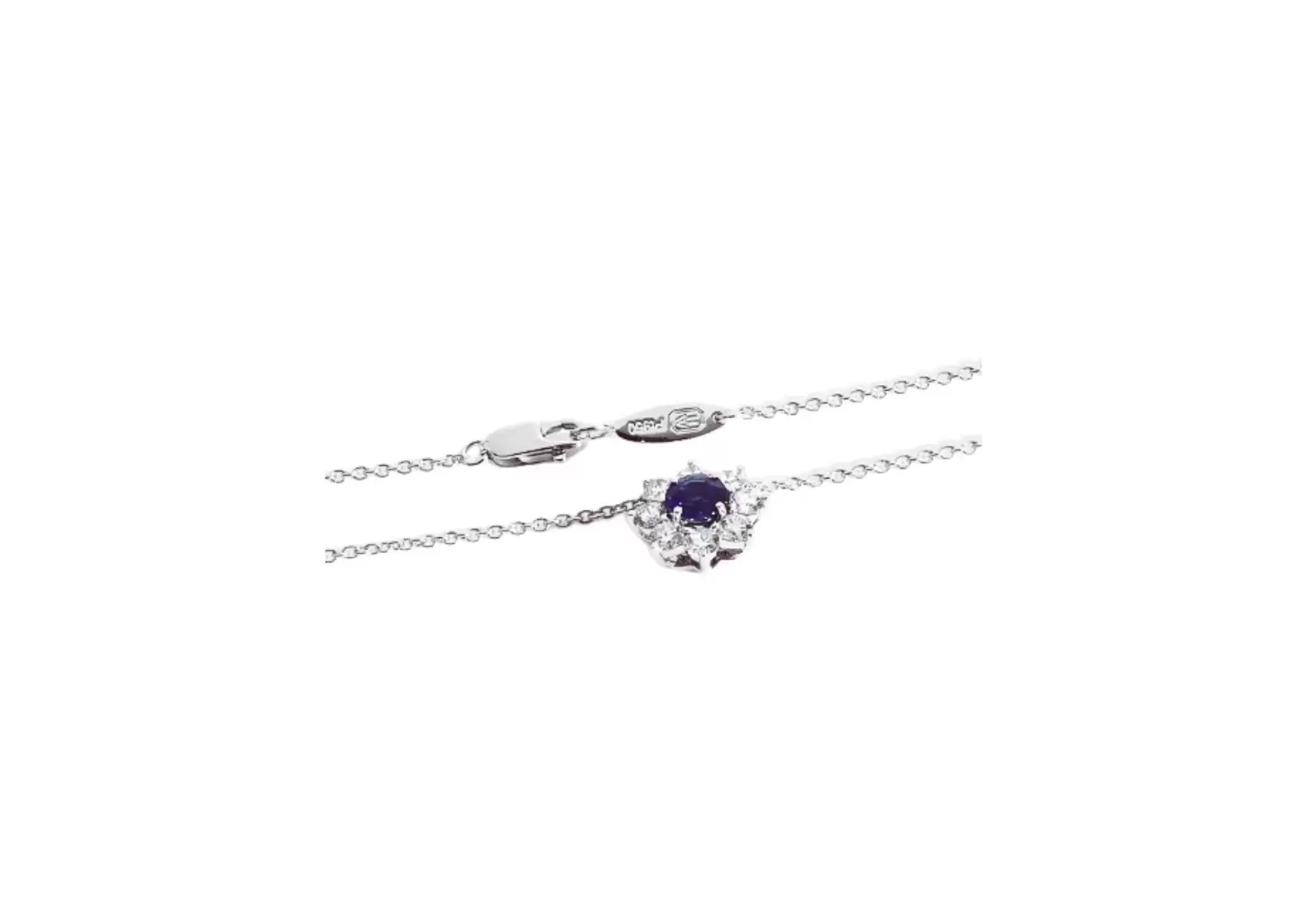 Surrounding the radiant sapphire are eight round brilliant diamonds, meticulously handpicked to enhance the pendant's allure. These dazzling diamonds, with a total weight of approximately 0.44 carats, exude a brilliant sparkle that beautifully complements the sapphire's rich color.