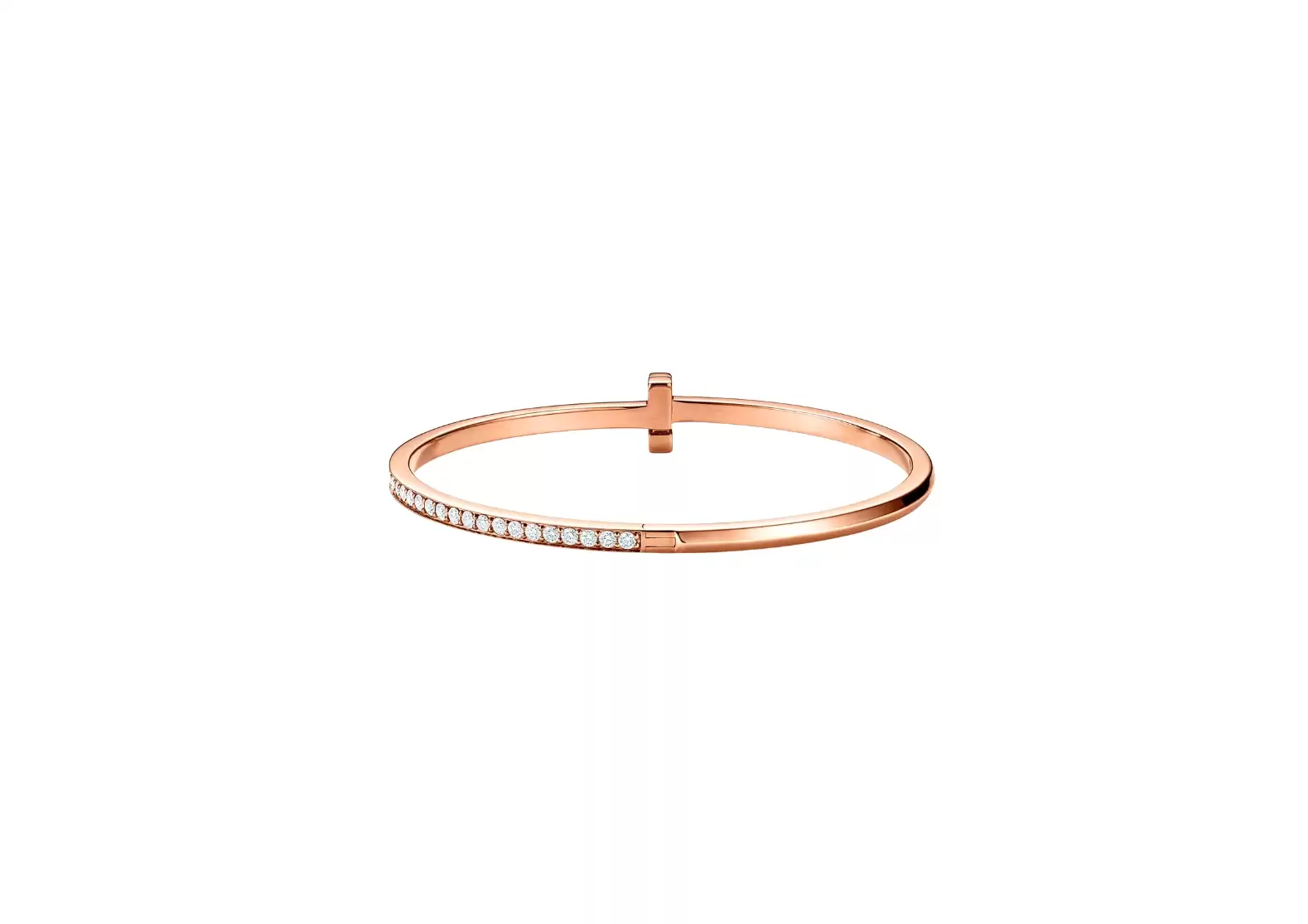 Introducing the exquisite Preloved: Tiffany T T1 Hinged Bangle in Rose Gold with Diamonds, Narrow | 68315778. This stunning piece of jewelry is designed to wrap around the wearer in a continuous, unbroken circle, symbolizing eternity and everlasting beauty.