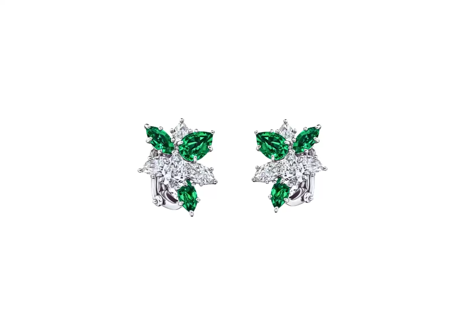 The vibrant green hues of the emeralds are perfectly complemented by the brilliance of 8 marquise and pear-shaped diamonds, weighing a total of approximately 2.88 carats. Each precious gemstone is meticulously set in a lustrous platinum frame, enhancing their natural beauty and ensuring a timeless appeal.