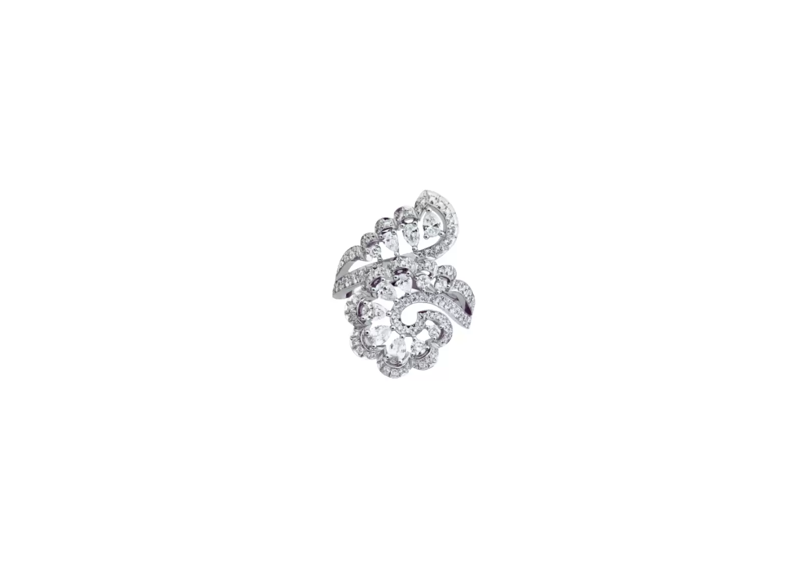 Introducing Preloved: Precious Lace Vague Ring, a truly ethereal piece crafted with utmost care and adorned with exquisite diamonds. This stunning ring showcases the feather-light dimensions and graceful curves that form a mesmerizing lace-like pattern, reminiscent of gentle sea billows.
