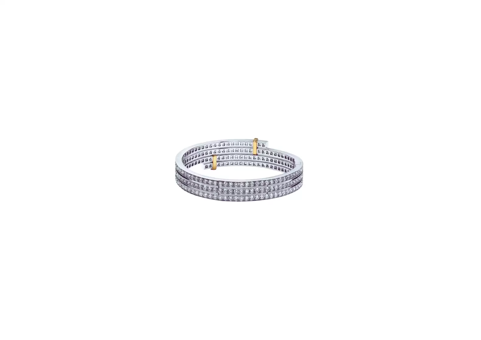 The Tiffany Edge collection showcases a distinctive 18k yellow gold accent that seamlessly connects multiple rows of round brilliant diamonds. The result is a breathtaking balance between sleek lines and dazzling diamonds, making this bracelet a true showstopper.