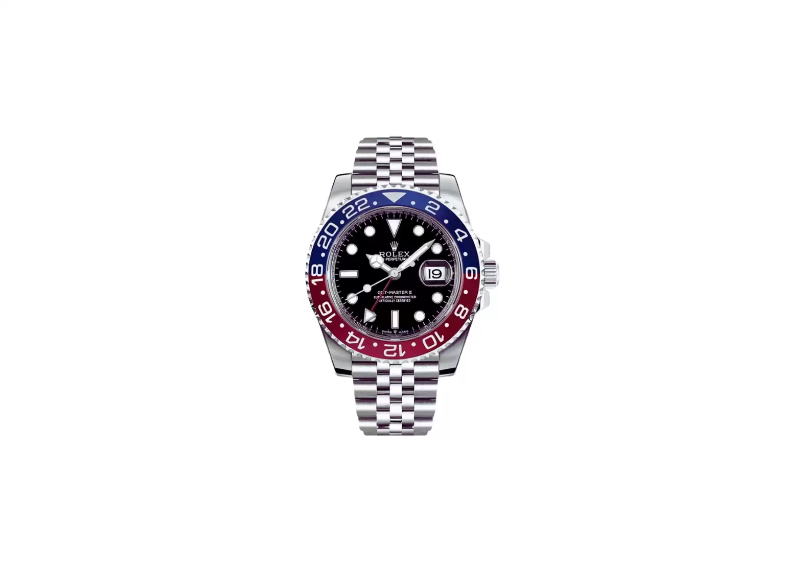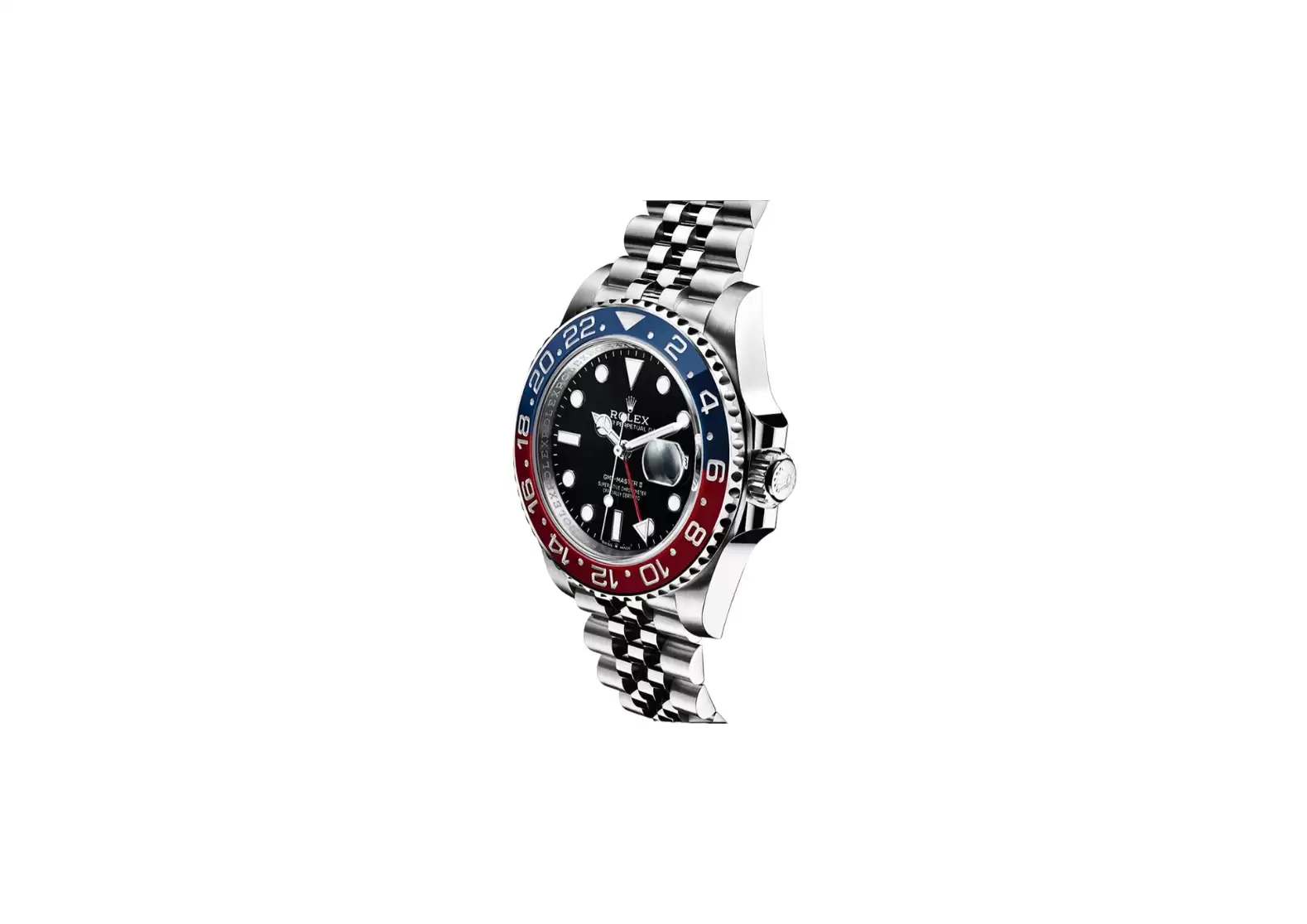 The black dial of the Rolex GMT-Master II "Pepsi" 126710BLRO Watch enhances readability with luminescent dot hour markers and hands. The date window, magnified through the cyclops lens, ensures easy viewing of the current date.