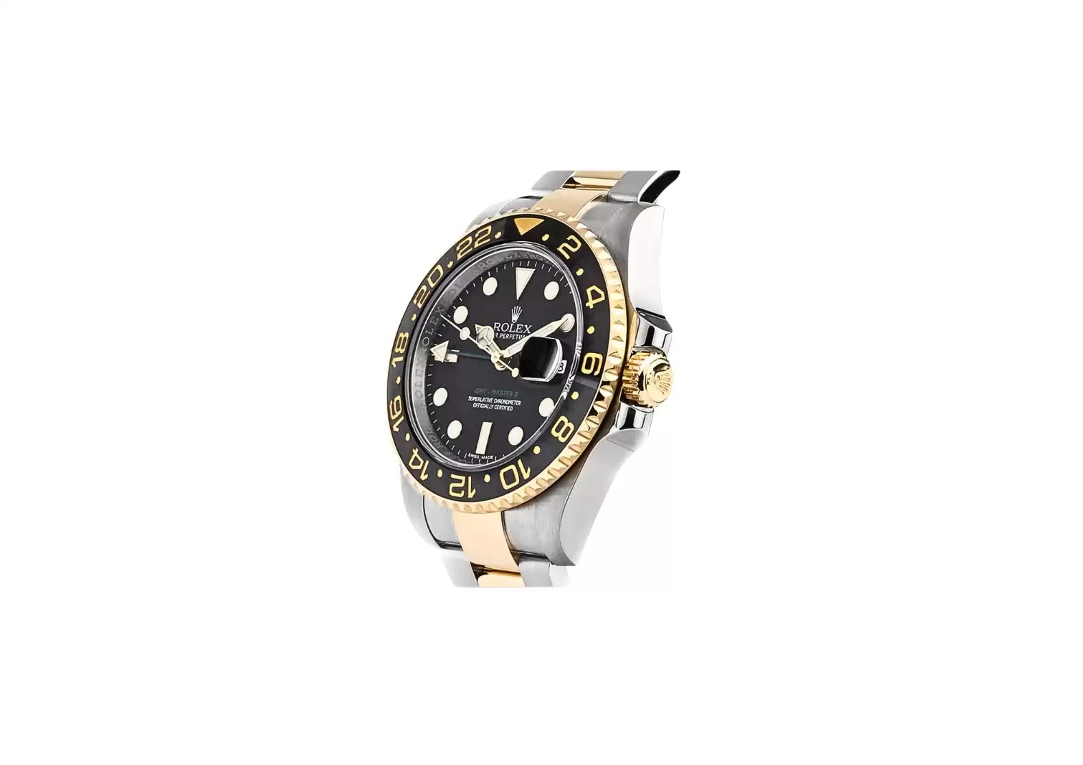 This Rolex GMT-Master II features a polished solid 18k yellow gold with brushed 904L Oystersteel stainless steel case, exuding a timeless and luxurious appeal. The matching bracelet, also made of polished solid 18k yellow gold with brushed 904L Oystersteel stainless steel, adds to the overall elegance of the watch.