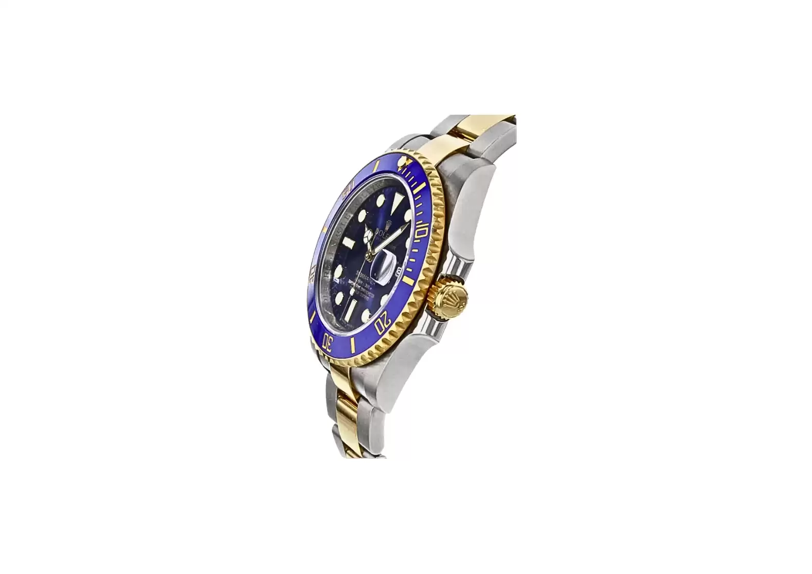 The solid 18k Rolesor yellow gold bezel with a blue Cerachrom ceramic bezel insert adds a touch of luxury and durability to this timepiece. The date feature is displayed at 3 o'clock, with a cyclops lens over the date for easy reading. The instantaneous date setting feature ensures accurate timekeeping.
