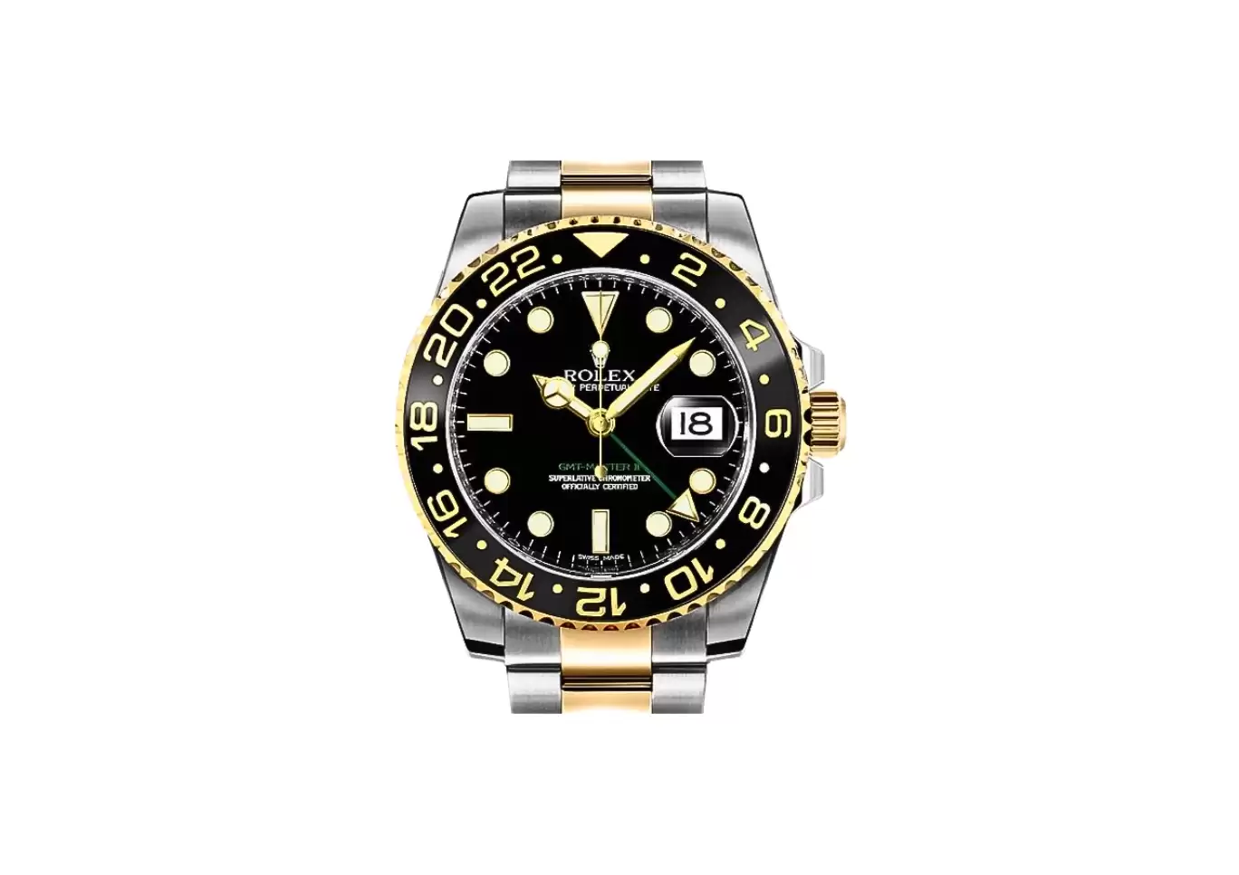 DescriptionIntroducing the Rolex GMT-Master II Two Tone Black Dial Men's Watch 116713LN-0001, a luxurious timepiece that combines style and functionality. This Swiss-made watch is equipped with a range of impressive features that make it a must-have for any watch enthusiast. The black dial of this watch is adorned with dot hour markers, ensuring easy readability at a glance. The black Cerachrom insert ceramic bezel adds a touch of sophistication, featuring 24-hour engraved numerals and graduations for convenient timekeeping in different time zones. With its date feature, displayed at 3 o'clock and magnified by the cyclops lens, you'll never miss an important date again. The GMT second time zone feature allows for independent rapid-setting of the hour hand, making it effortless to keep track of time in multiple locations. This timepiece is powered by a self-winding automatic movement, certified as a COSC Superlative Chronometer. The Rolex Caliber 3186 ensures accurate timekeeping, with vibrations per hour of 28,800 and 31 jewels. With a 48-hour power reserve, you can rely on this watch to keep ticking day after day. Rest assured that this Rolex GMT-Master II watch is guaranteed authentic, with a certificate of authenticity included. It comes in a manufacturer box, accompanied by a manual for your convenience. The polished solid 18k yellow gold with brushed 904L Oystersteel stainless steel case and bracelet exude elegance and durability. Featuring a scratch-resistant sapphire crystal and 100 meters (330 feet) of water resistance, this watch is built to withstand everyday wear and tear. The 40mm (1 1/2") case diameter and 12mm case thickness provide a comfortable fit on your wrist, accommodating up to a 7.5" wrist size. The bidirectional rotating 24-hour graduated bezel adds a touch of versatility, while the yellow gold-plated luminescent hands and hour markers ensure visibility even in low-light conditions. The screw-down crown and case back guarantee water resistance, while the Oystersteel folding Oysterlock safety clasp with Easylink 5mm comfort extension link offers a secure and adjustable fit. With a 6-year warranty, this Rolex GMT-Master II Two Tone Black Dial Men's Watch 116713LN-0001 is a timeless investment that combines luxury and practicality. Elevate your style and stay on time wherever you go with this exceptional timepiece. |