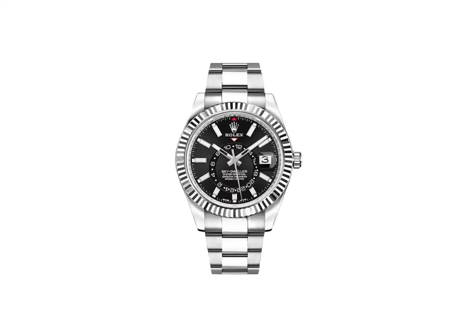 Introducing the Pre-owned Rolex Sky-Dweller White Gold Fluted Bezel Men's Luxury Watch 326934-0005. This exquisite timepiece boasts a range of impressive features that make it a must-have for any discerning watch enthusiast.