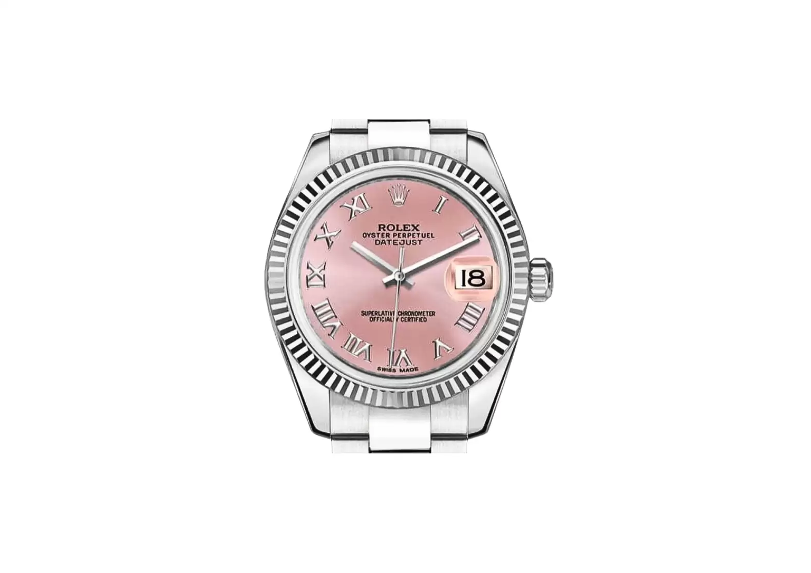 Crafted with precision and attention to detail, this Swiss-made watch features a stunning pink dial adorned with Roman numeral hour markers, adding a touch of classic charm. The polished solid 18k white gold fluted bezel enhances the overall aesthetic, making it a true statement piece.