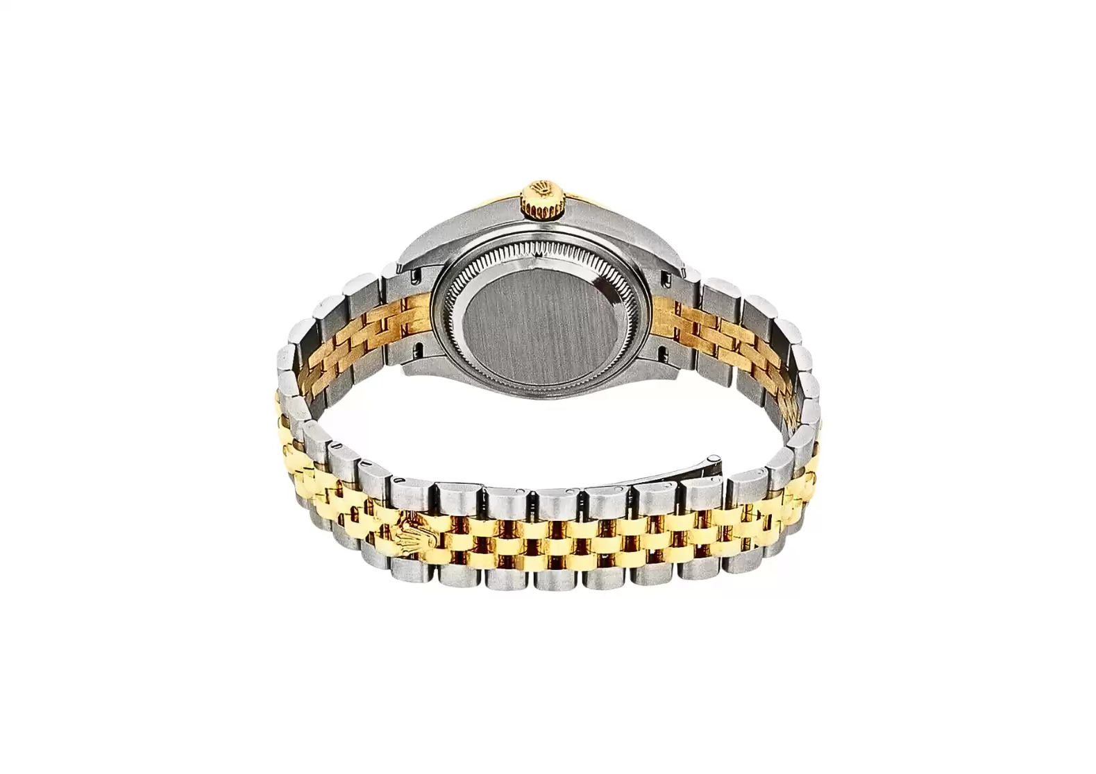 The 28mm polished 904L Oystersteel stainless steel case is both durable and stylish, while the polished solid 18k yellow gold with brushed 904L Oystersteel stainless steel Jubilee bracelet adds a touch of sophistication. The scratch-resistant sapphire crystal protects the dial, ensuring clarity and longevity.